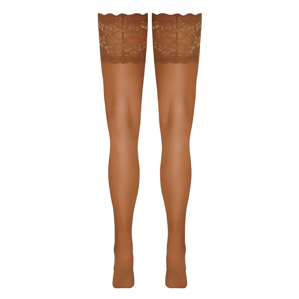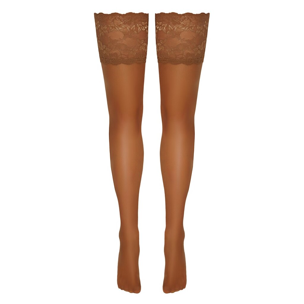 Halterlose, hautfarben helle Strümpfe von Cottelli LEGWARE mit schönem 14 cm breitem Spitzen-Abschluss. Innen mit Silikonverstärkung für rutschfesten Sitz und optimalen Halt. Garnstärke 20 den. Oeko-Tex zertifiziert.