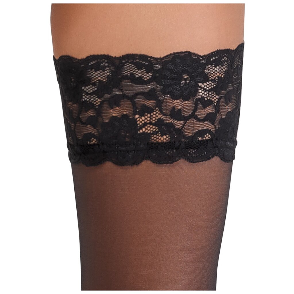 Halterlose schwarze Strümpfe von Cottelli LEGWARE mit schönem 9 cm breitem Spitzen-Abschluss. Innen mit Silikonverstärkung für rutschfesten Sitz und optimalen Halt. Garnstärke 20 den. Oeko-Tex zertifiziert.