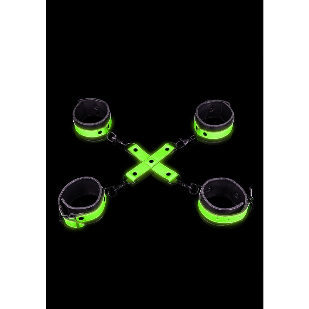 These hand and ankle cuffs with hogtie will fulfil all your kinky dreams! The matching wrist and ankle cuffs make sure you're not going anywhere. Ouch! Glow-in-the-Dark products need to be activated with sunlight before you can enjoy them in the dark. Hogtie: 12 x 12 x 0.5 cm, 29 g / Handcuffs: 30 x 5 x 0.5 cm, 80 g / Legcuffs: 35 x 5 x 0.5 cm, 87 g / Materials: 90% PU leather, 10% metal