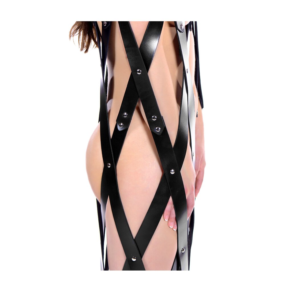 Cet incroyable dispositif de bondage est composé de solides lanières de cuir, conçues pour envelopper, enfermer et ensorceler votre sujet. La base solide de la plate-forme permet à votre partenaire de se tenir debout à l'intérieur. Lorsqu'il marche sur la plate-forme en bois recouverte de cuir, le poids tire les lanières de cuir entrecroisées vers le bas, emprisonnant votre sujet à l'intérieur. Le mécanisme est similaire à celui d'un piège à doigts chinois. Une fois à l'intérieur, votre partenaire est pris au piège et à votre merci. Les lanières de cuir s'enroulent autour de votre partenaire, enveloppent son corps et s'enroulent en spirale vers le haut, se rejoignant au sommet où les lanières s'attachent à un solide anneau de métal gainé de cuir.