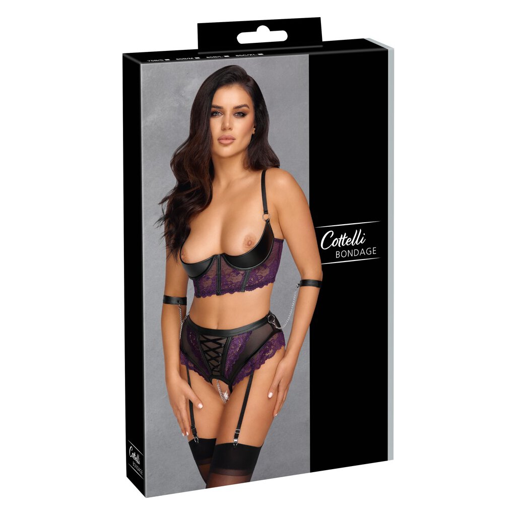 Longline-Hebe, Straps-Slip ouvert und 2 Handfesseln vereint im Set von Cottelli BONDAGE. Hebe und Slip aus lilafarbener weicher Blütenspitze mit Details im edlen schwarzen Mattlook. Straps-Slip zusätzlich mit Powernet-Einsätzen. Die länger geschnittene Hebe mit leicht gepolsterten Bügel-Cups bringt den Busen in Hochform und direkt ins Blickfeld. Die Träger und der Hakenverschluss im Rücken sind passend verstellbar. Der taillenhoch geschnittene Straps-Slip verführt mit dekorativer Zierschnürung vorne und einem komplett offenen Schritt mit stimulierender Schrittkette (abnehmbar). Die Strumpfhalter sind passend verstell- und auch komplett abnehmbar. Seitlich am Taillenbund jeweils ein Ring, an dem die beiden beiliegenden soften Handfesseln mit ihren Karabiner-Ketten eingehakt werden können. Fesseln mit verstellbaren Klettverschlüssen.
