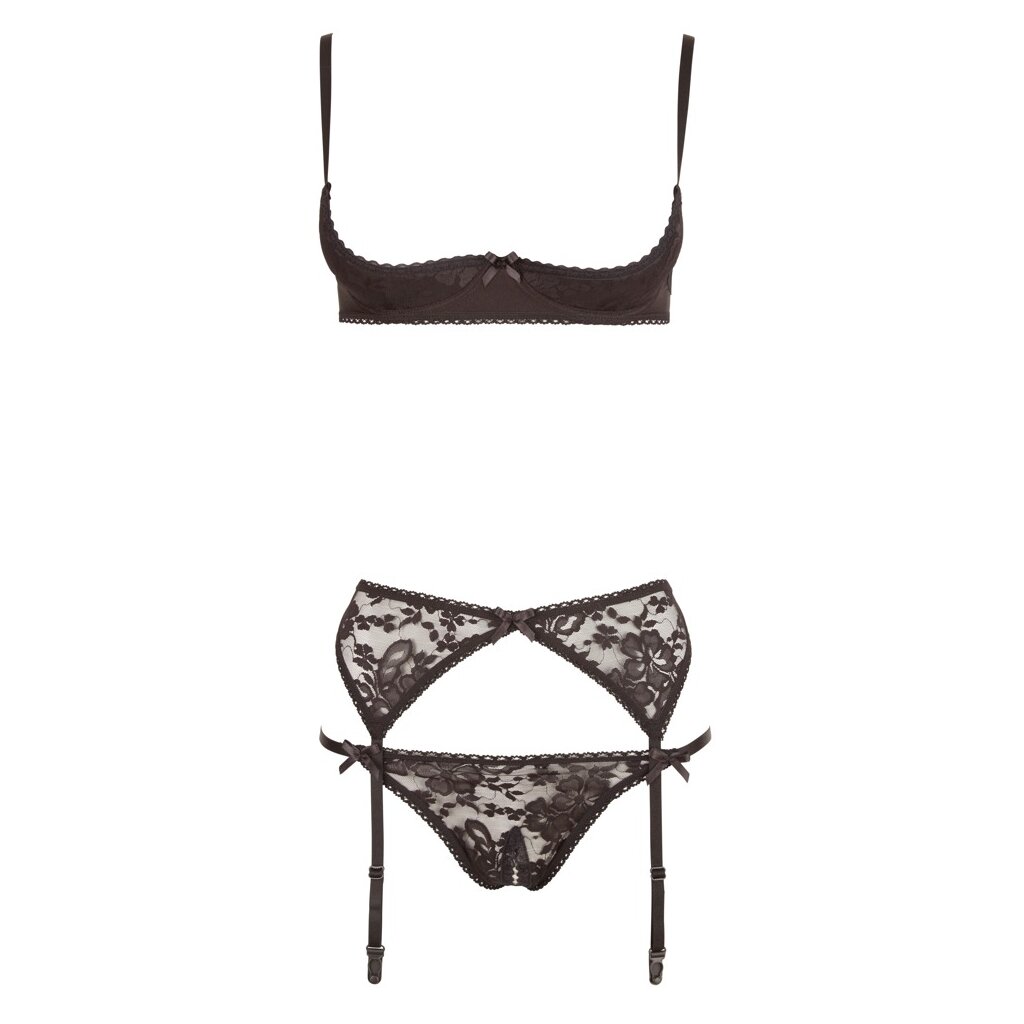 Soutien-gorge à étagères, string sans entrejambe et porte-jarretelles dans un ensemble. Les trois articles sont fabriqués en dentelle noire. Soutien-gorge à plateau avec bonnets légèrement rembourrés, string avec entrejambe ouvert. 90 polyamide, 10% spandex. Sans bas.