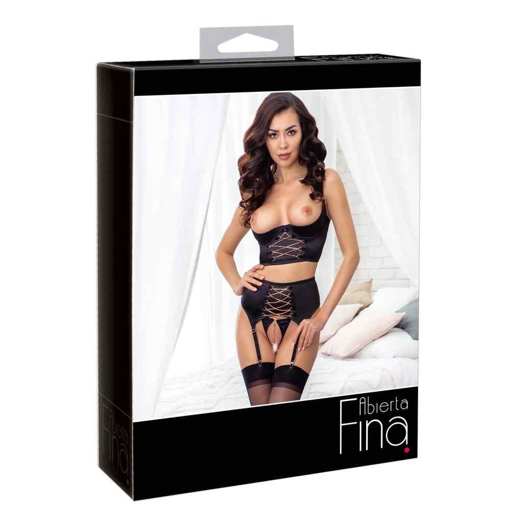 Soutien-gorge à étagères légèrement rembourré, porte-jarretelles et string sans entrejambe de la marque Abierta Fina en beau satin noir extensible avec des détails de couleur rose-or. Le soutien-gorge à armatures est long, avec une fermeture à crochets dans le dos et des bretelles réglables. Le large porte-jarretelles a également une fermeture à crochets à l'arrière et des bretelles réglables. Le soutien-gorge et le porte-jarretelles sont tous deux pourvus de petites chaînes qui forment un laçage sur le devant. Le string assorti est complètement sans entrejambe et possède une chaîne amovible au-dessus de l'entrejambe.