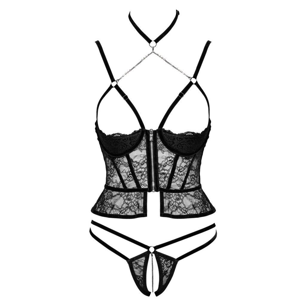 Longline-Hebe und Slip ouvert vereint im Set von Abierta Fina. Alles ist aus feiner weicher elastischer Spitze gearbeitet und mit Samtstreifen und -details geschmückt. Die länger geschnittene Hebe mit leicht gepolsterten Bügel-Cups bringt den Busen in Hochform und direkt ins Blickfeld. Ein kleiner Volant schmeichelt der Taille. Der silberfarbene Reißverschluss vorne sorgt für bequemes An- und Auskleiden. Die Dekolleté-Ketten sowie das Halsband sind von der Hebe abnehmbar. Die Dekolleté-Riemchen und die Samt-Träger sind passend verstellbar. Der vorne raffiniert mit Stretchbändern designte Spitzen-Slip verführt mit seinem offenen Schritt und einer stimulierenden Schrittkette, die auch abgenommen werden kann.
