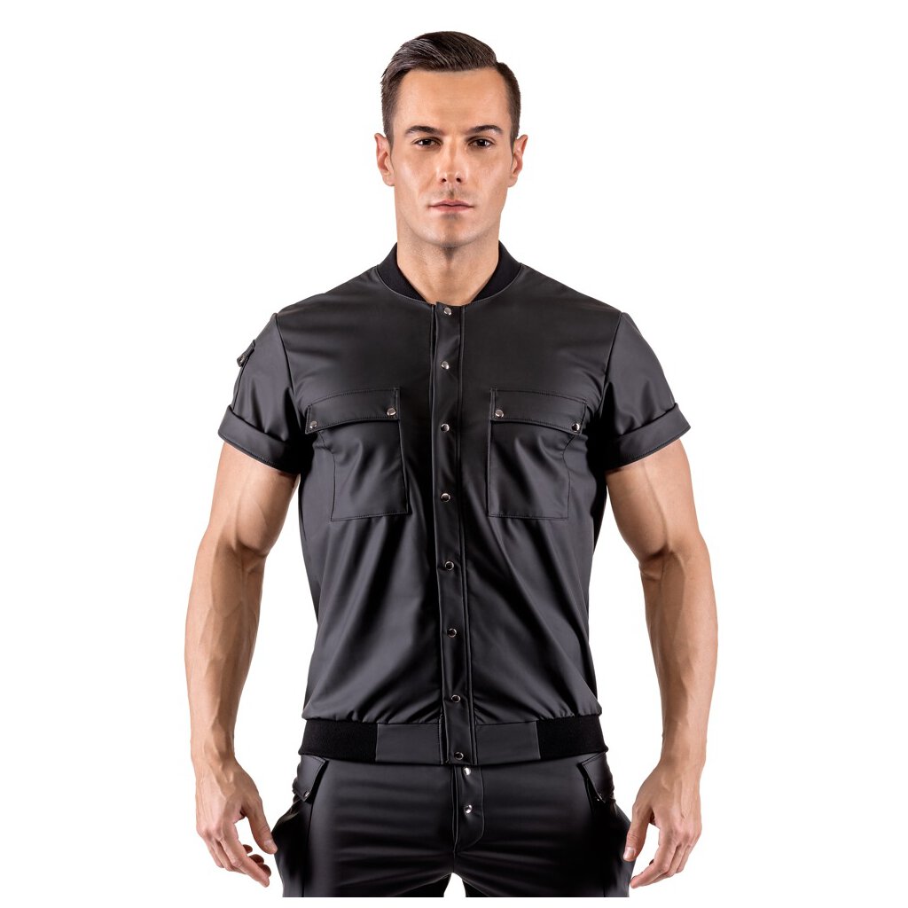 Schwarzes, locker sitzendes Hemd von Svenjoyment aus leichtem Stretchmaterial mit trendigem Matteffekt. Im Blouson-Stil mit durchgehender Druckknopfleiste, sowie den typischen Strickeinsätzen im Kragen und Bund. Vorne 2 aufgesetzte Brusttaschen und kleine Tasche am Ärmel - alle Taschen mit Druckknopfverschluss.