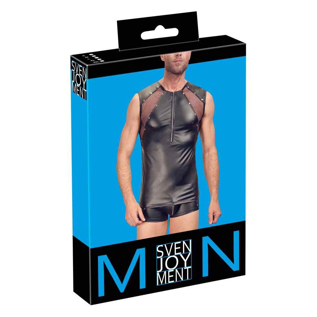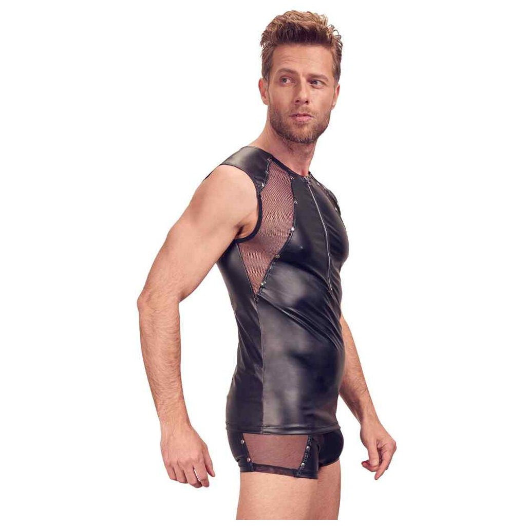 La chemise sans manches, qui met en valeur la silhouette, est réalisée en matière extensible, noire, d'aspect mat, avec des empiècements en filet et une décoration à clous frappante. Avec une fermeture éclair à l'avant.