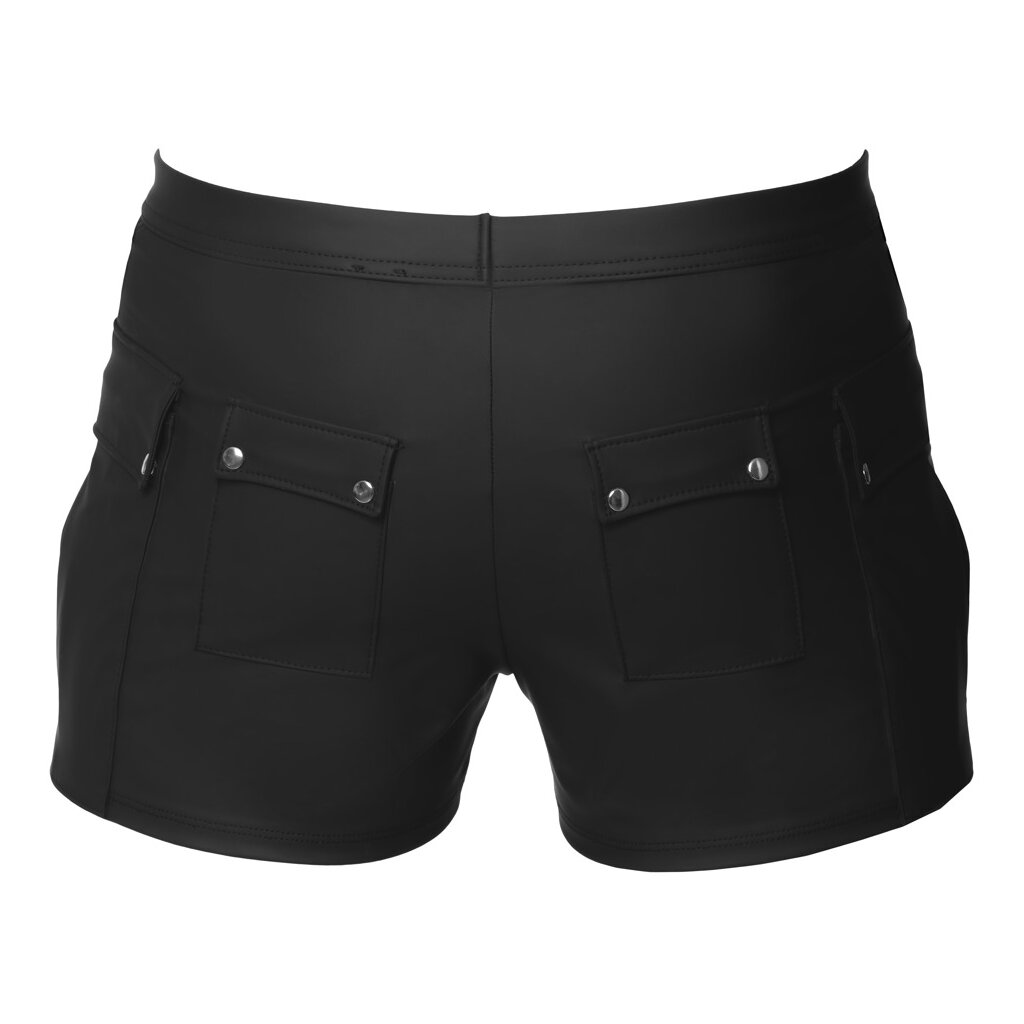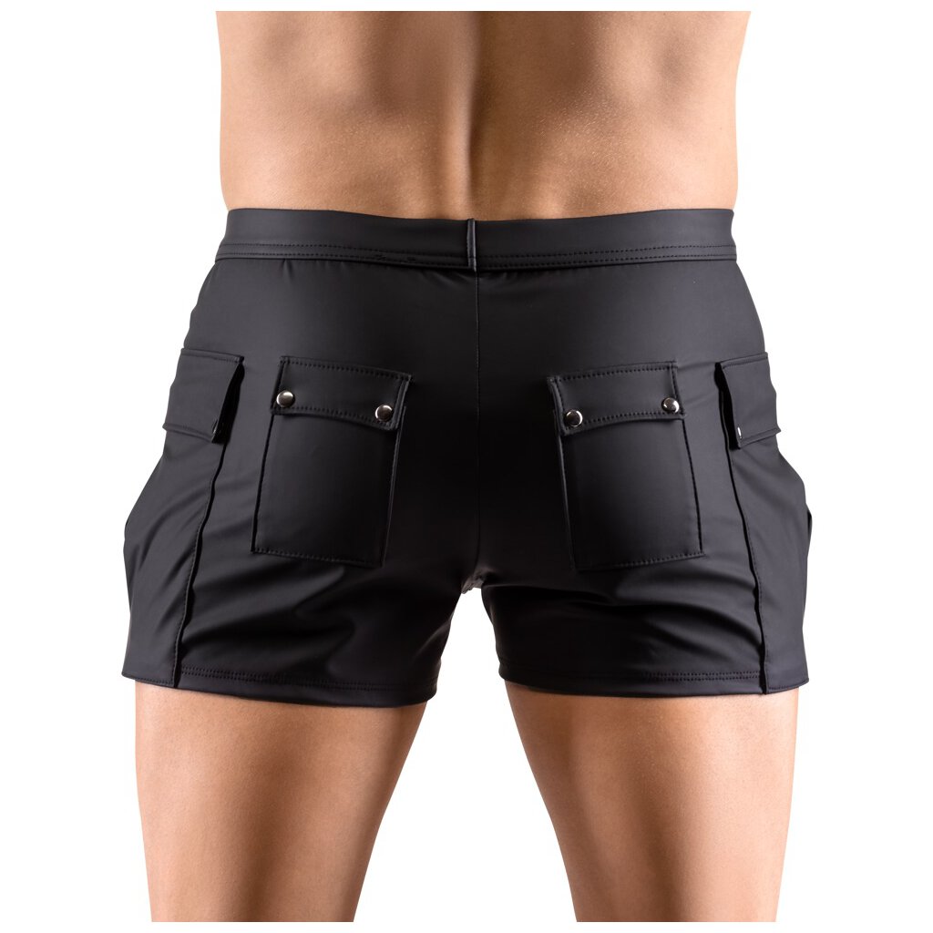 Schwarze, locker sitzende Shorts von Svenjoyment aus leichtem Stretch-Material mit trendigem Matteffekt. Im Worker-Style mit Druckknopfleiste, sowie 2 großen Taschen an der Seite und 2 aufgesetzten Taschen am Gesäß - alle Taschen mit Druckknopfleiste.