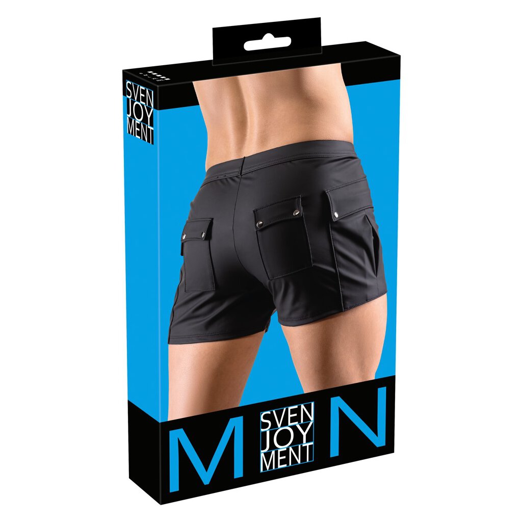 Schwarze, locker sitzende Shorts von Svenjoyment aus leichtem Stretch-Material mit trendigem Matteffekt. Im Worker-Style mit Druckknopfleiste, sowie 2 großen Taschen an der Seite und 2 aufgesetzten Taschen am Gesäß - alle Taschen mit Druckknopfleiste.