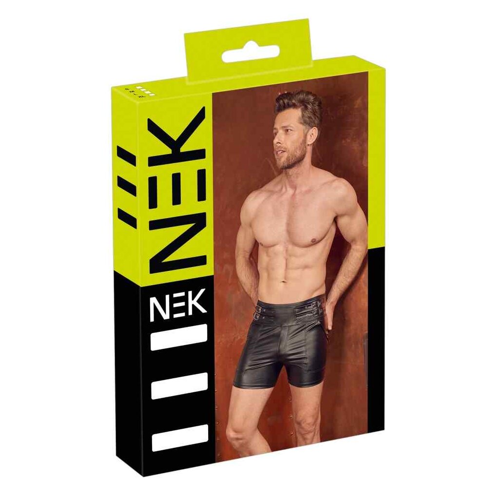 Black shorts made out of trendy matte look material. They are high-waist shorts which have two adjustable buckle straps at either side. There is a practical, padded zip at the front that can be unzipped quickly for erotic fun. Wonderfully stretchy pants that are extremely comfortable to wear.