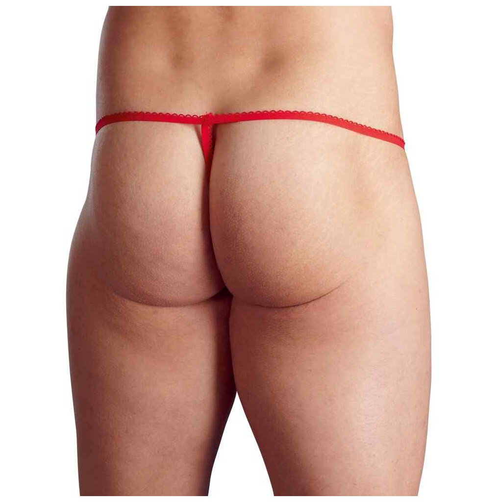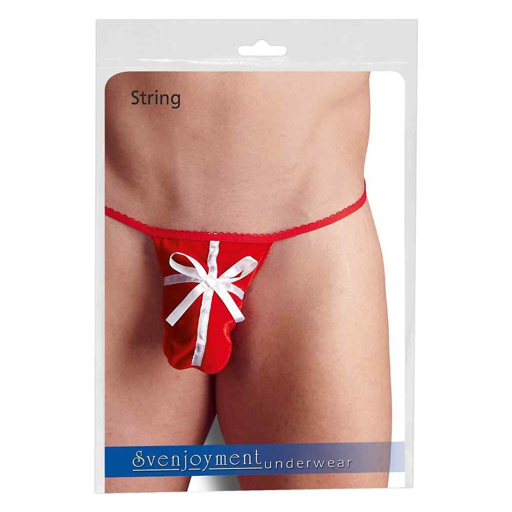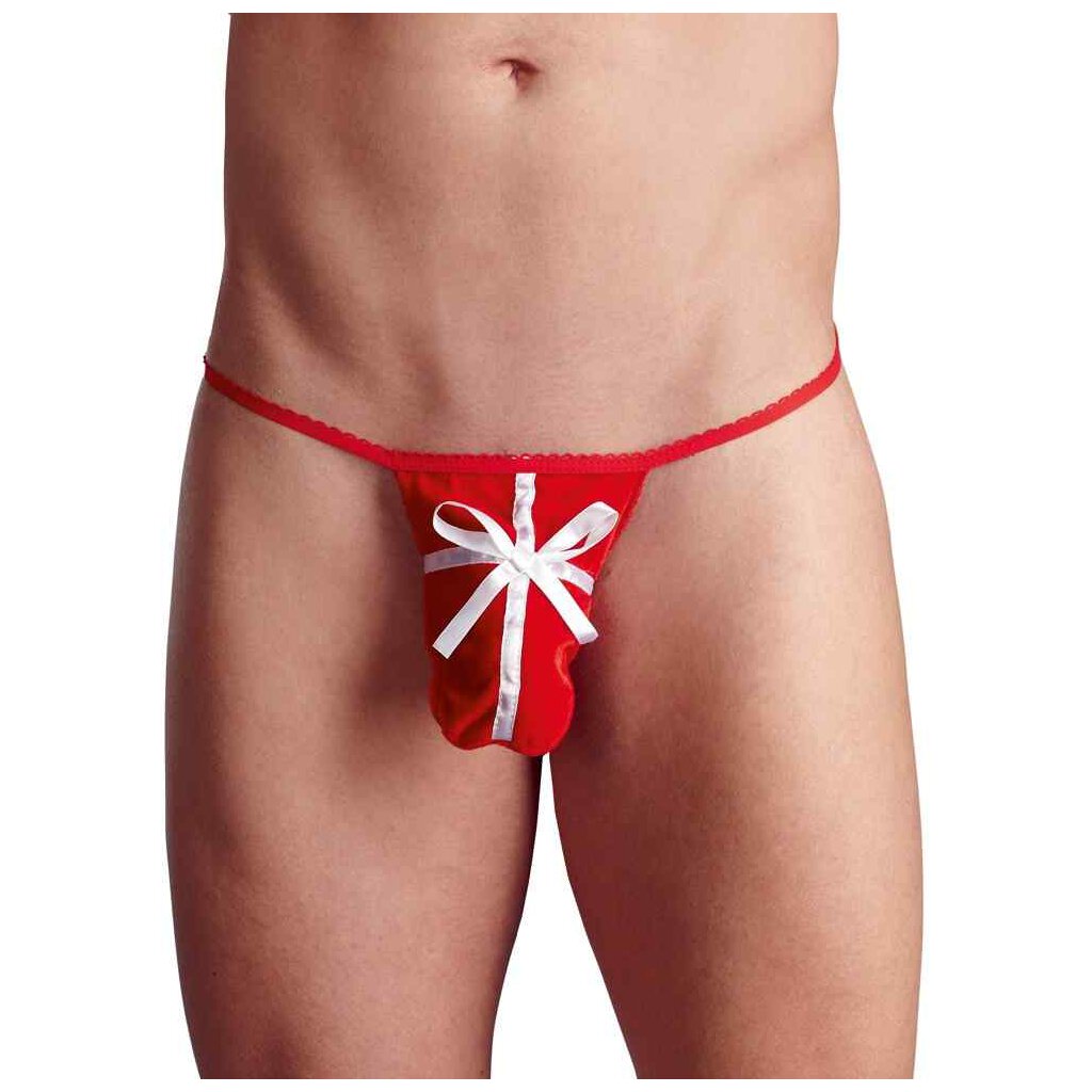 Roter String im Geschenk-Look aus streichelweichem Pannesamt mit weißen Satinbändern.