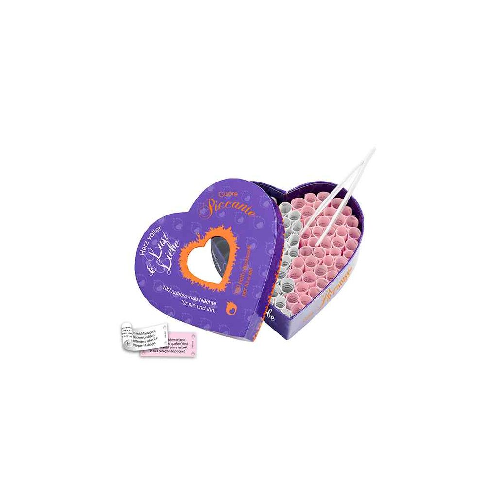 Die herzförmige Schachtel enthält hundert Papierröllchen: fünfzig rosa Röllchen für sie, fünfzig weiße für ihn. Auf diese Weise kann man fast ein Jahr lang zwei mal wöchentlich eine spannende Herausforderung angehen, zusammen aufreizende Nächte erleben und einander auf spielerische Weise erkunden. Beide Liebespartner bekommen die volle Aufmerksamkeit des anderen zu spüren.