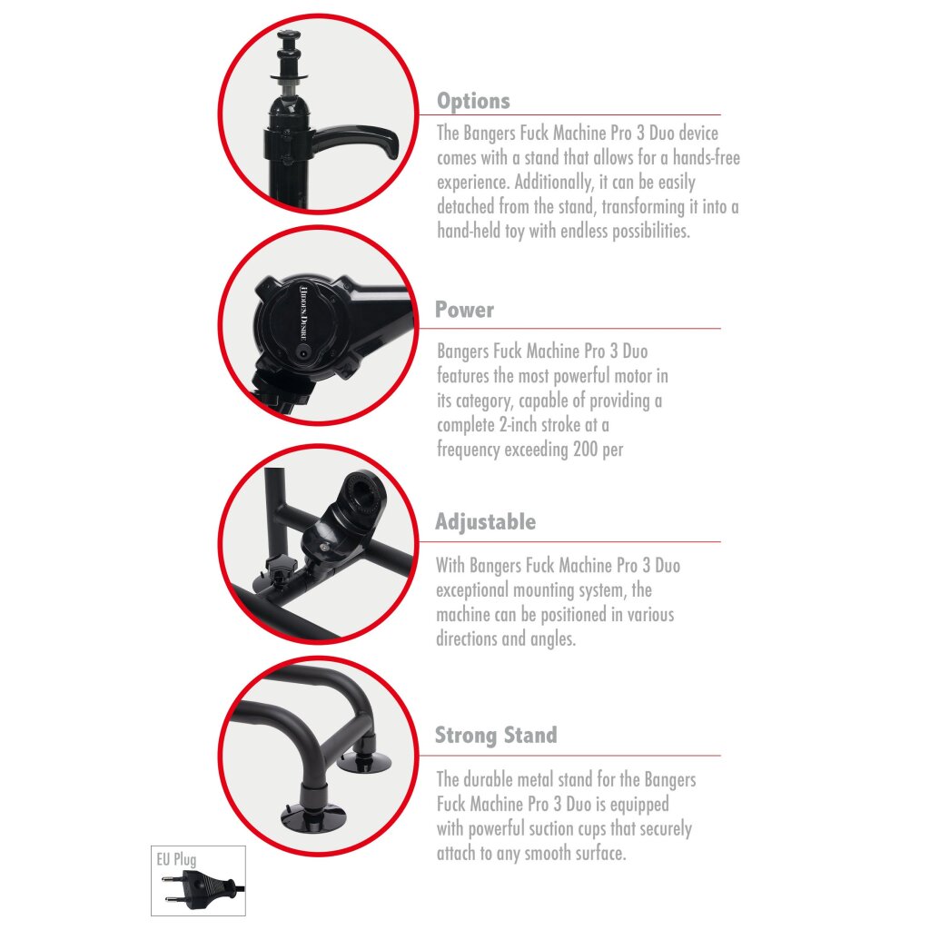Options - The Bangers Fuck Machine Pro 3 Duo comes with a stand for a hands-free experience. It can also be easily detached from the stand, transforming it into a handheld toy with endless possibilities.