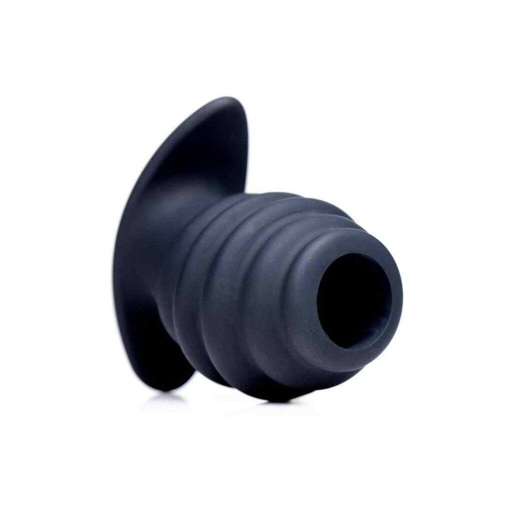 This hollow butt plug is ribbed for your anal pleasure! The design features strong grooves that provide comfort while massaging your hole. The tunnel in the core allows you to insert an anal-safe vibrator, a liquid of your choice and more! You can even give your partner a peek inside. This curved plug is ideal for the prostate, but also feels very comfortable in a female body. Thanks to the ergonomic base, it sits comfortably between your cheeks and can be worn for hours. This unique plug is made of high-quality silicone, which makes it body-friendly. The non-porous and phthalate-free material is not compatible with silicone lubricants, but can be easily disinfected with mild soap or toy cleaner.