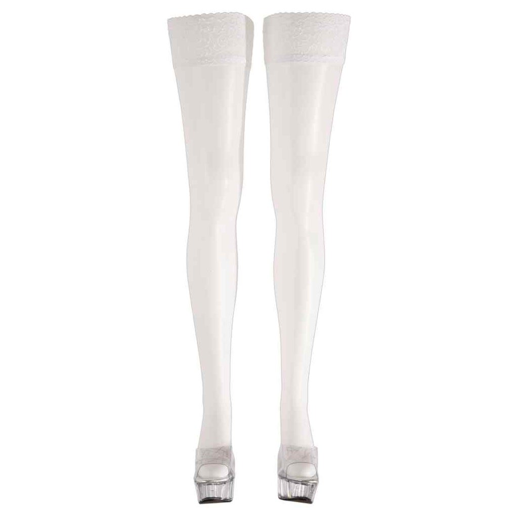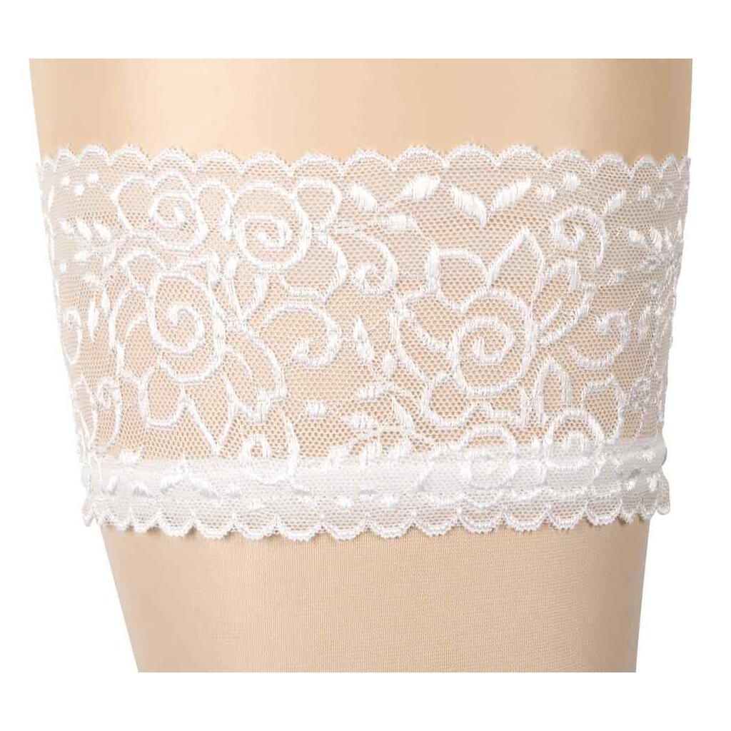 Jarretelles avec une partie supérieure en dentelle de 7 cm de large. Dans une belle couleur blanche pour des apparences excitantes. 17 deniers. Certifié Oeko-Tex.