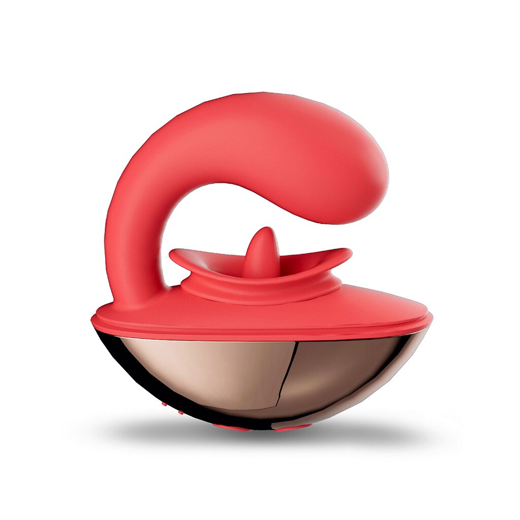 The IY Rondy is a discreet clitoral vibrator with licking tongue, designed for dual stimulation. Its smart design features two parts: a long and slightly curved stimulator for internal use with 10 vibration functions, and a soft tongue that provides external licking sensations. A protective cover keeps the toy safe and discreet when stored.