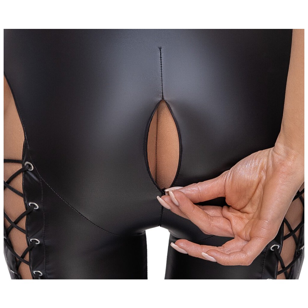 Combinaison élastique tout autour de Cottelli PARTY en look noir mat. En coupe moulante avec une longue jambe moulante, qui est pourvue d'un laçage devant et derrière ainsi que de haut en bas. A l'entrejambe avec une fermeture éclair pratique/érotique à double sens. Dos nu - collier avec fermeture à clip.