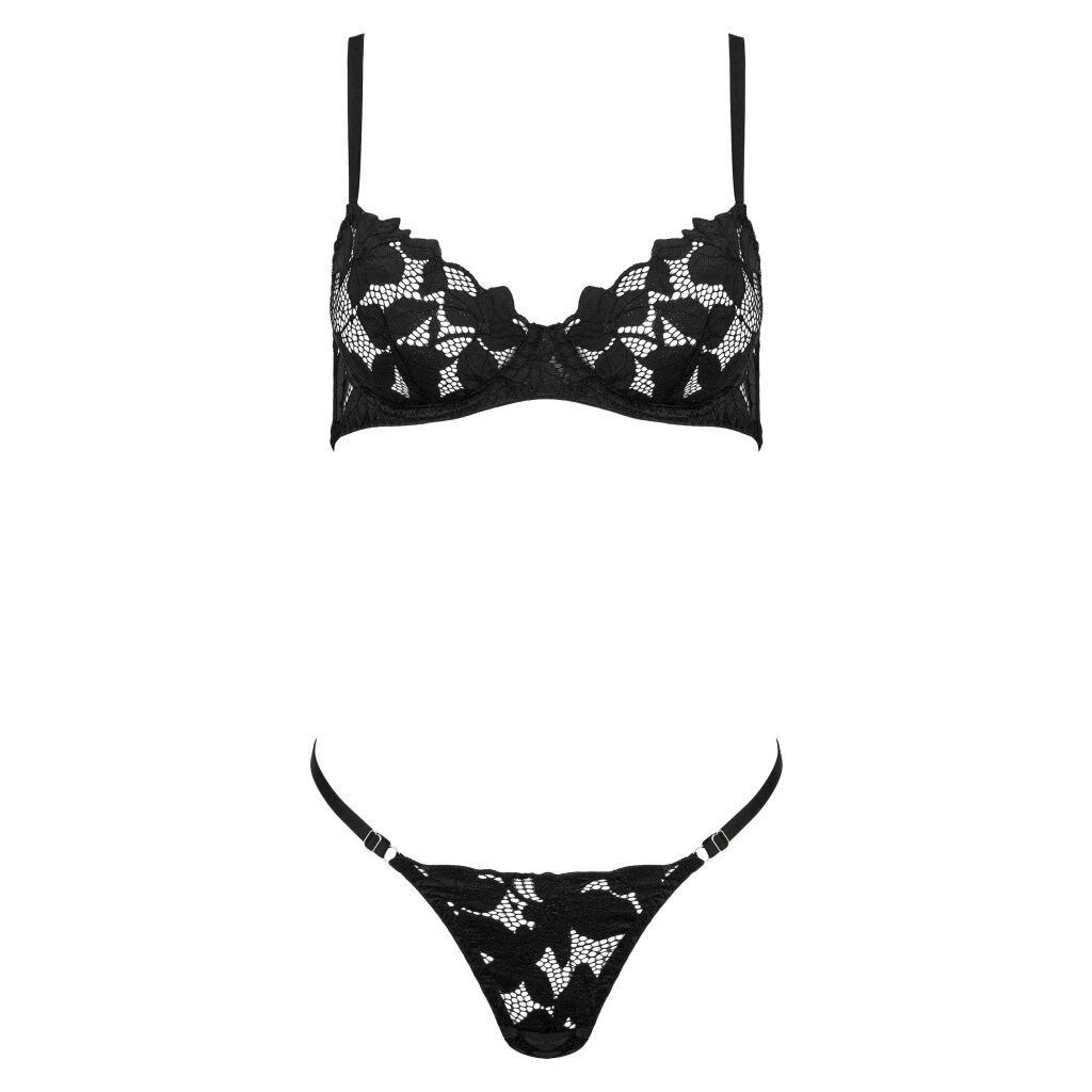 Delicate lace, fine straps, and a minimalist cut this two-piece set combines classic elegance with modern accents. The underwired bra features semi-transparent lace cups that accentuate the bust while remaining light and comfortable. The matching thong echoes the floral lace pattern and emphasizes the feminine Silhouette.