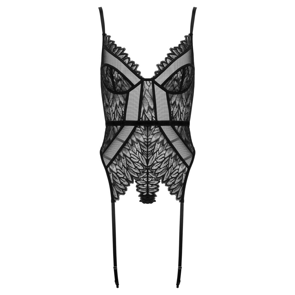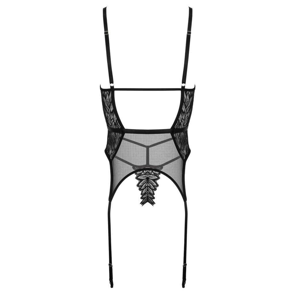 Dieses schwarze Korsett-Set ist ein absoluter Blickfang: Zarte Stickereien mit Blattmuster, transparente Mesh-Einsätze und verführerische Ausschnitte sorgen für eine atemberaubende Figur. Die weichen Cups bieten leichten Halt und sorgen zusammen mit den verstellbaren Trägern für einen bequemen und vorteilhaften Sitz.
