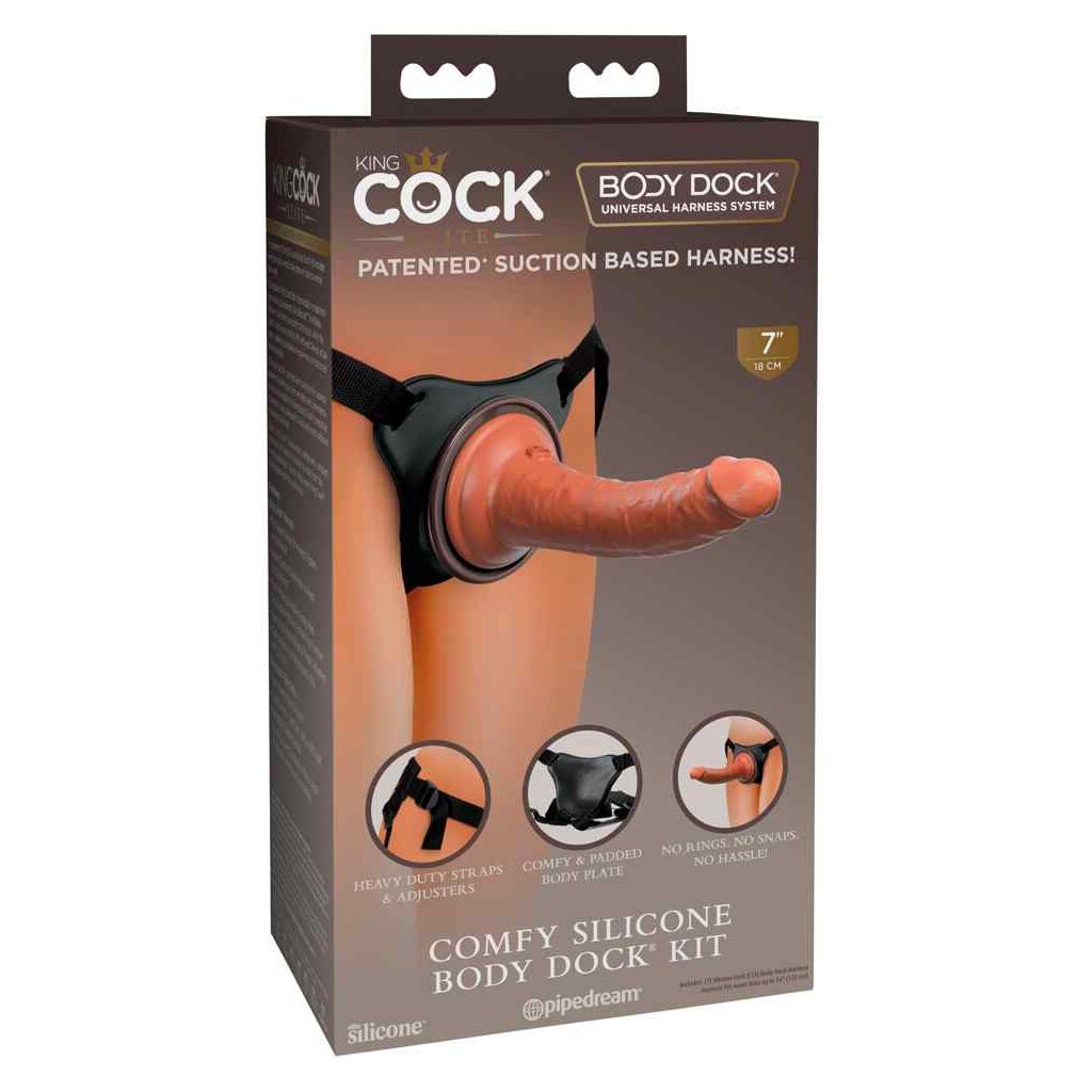Das Comfy Silicone Body Dock Kit von King Cock Elite enthält das bequeme Strap-on Comfy Body Dock und den höchst realistischen 7" Dual Density Silicone Cock Naturdildo für unbegrenzten Pegging-Spaß und lesbische Thrusting-Traum-Erfüllung.