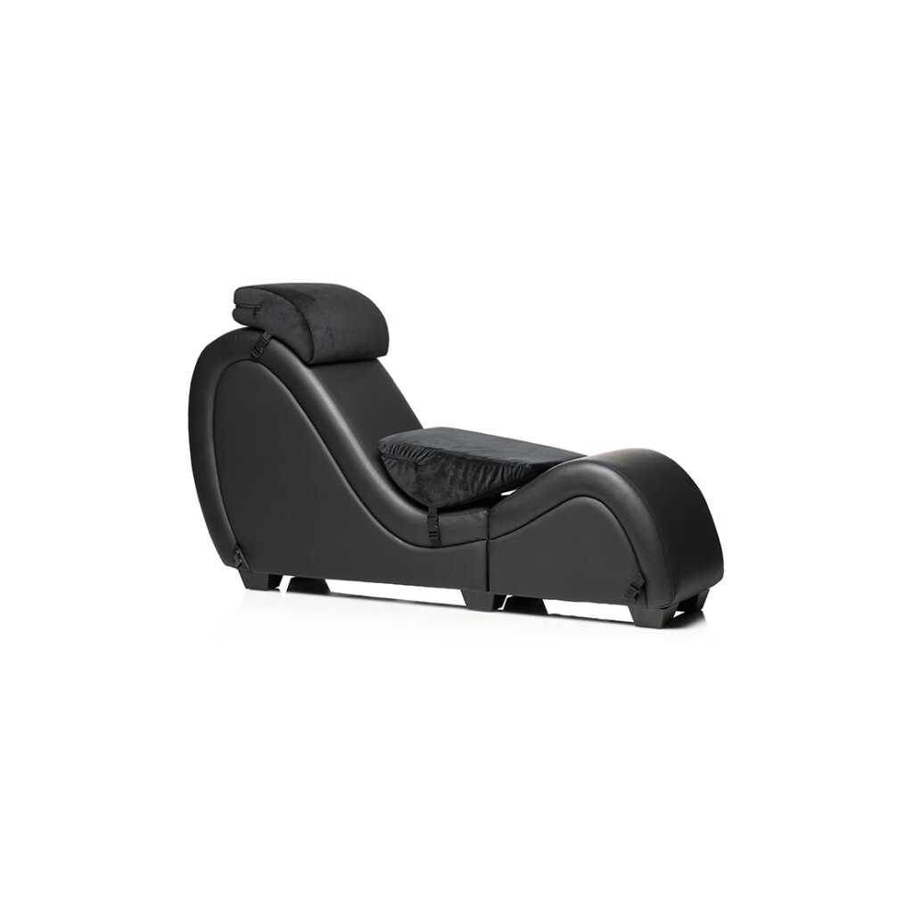 Want your very own sex dungeon at home but don't have the floor room to spare? This kinky sex chaise lounge breaks down into two pieces so you can store it when not in use! Tuck it away in a room, closet, or storage. Break it down to easily transport it from one place to the next! Never stress about fitting that couch through the tight hallway, stairwell or door again! Just unhook the metal brackets and take it piece at a time! Built out of durable wood and metal, it's covered with vegan-friendly PU leather. This faux leather is easy to clean and is smooth and seamless. The couch is comfortable and ergonomically built so you can explore more positions than ever before! Included with the couch are two Love Pillows that act as support aids for your head or chest at the top and allow comfortable sitting or kneeling when placed in the curve of the couch. Restrain your lover to the couch with the soft fleece wrist and ankle cuffs! They each connect via nylon straps to the base of the couch and are easy to adjust and remove. Assembly is easy; simply follow the directions included with the couch. Wash off the couch after a sexy scene with warm water and mild soap. Use a soft cloth to wipe it clean.