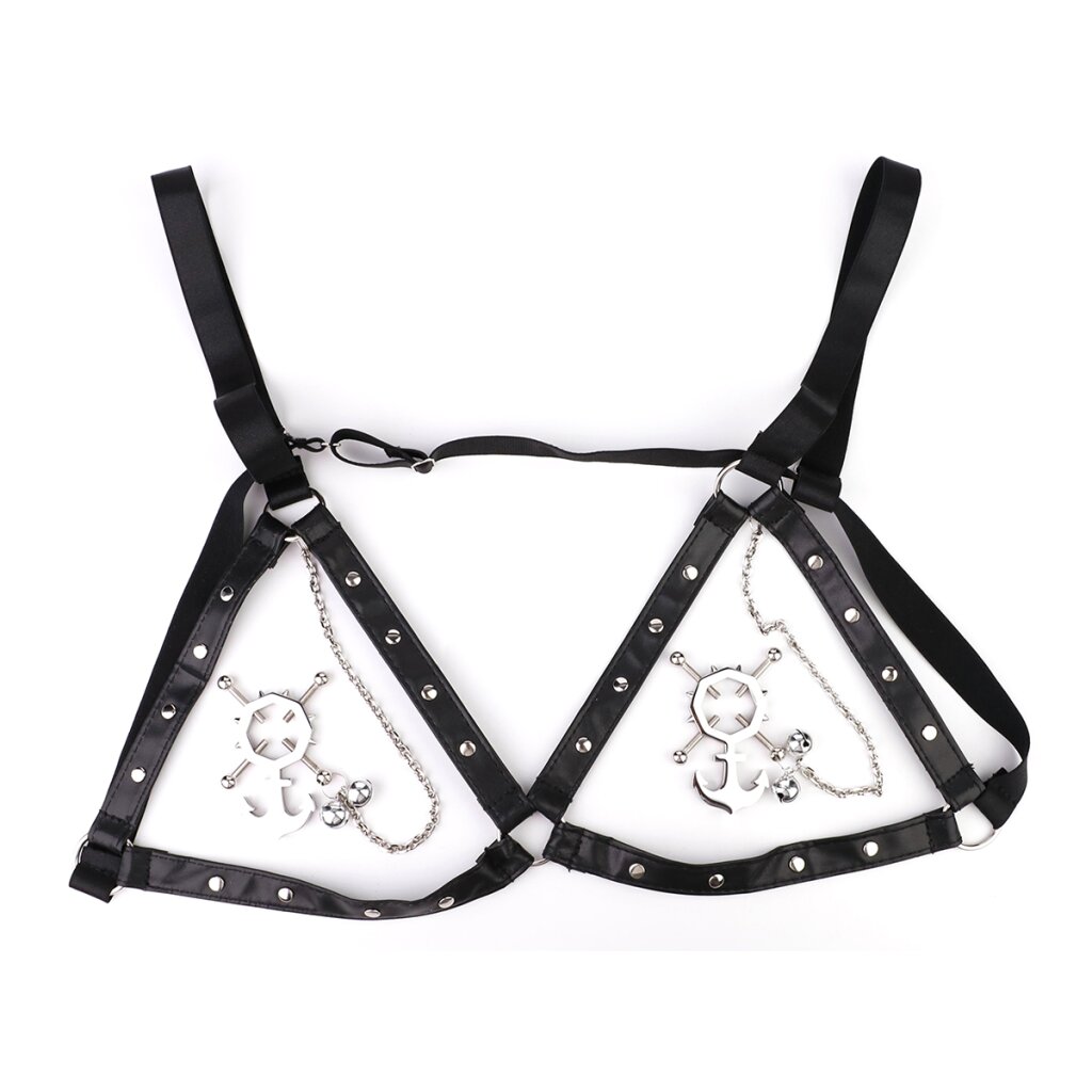 Verleihen Sie Ihrer Intimkollektion einen maritimen Touch mit diesem PU-Leder-Harness (offener BH) mit Anchor Nipple Clamps with Bells. Der mit Nieten besetzte Harness ist aus strapazierfähigem PU-Leder gefertigt, passt in eine Universalgröße und bietet mit seinem offenen BH-Design eine bequeme und verstellbare Passform.