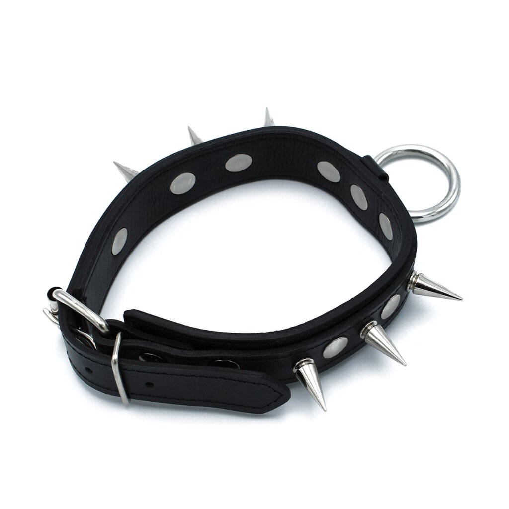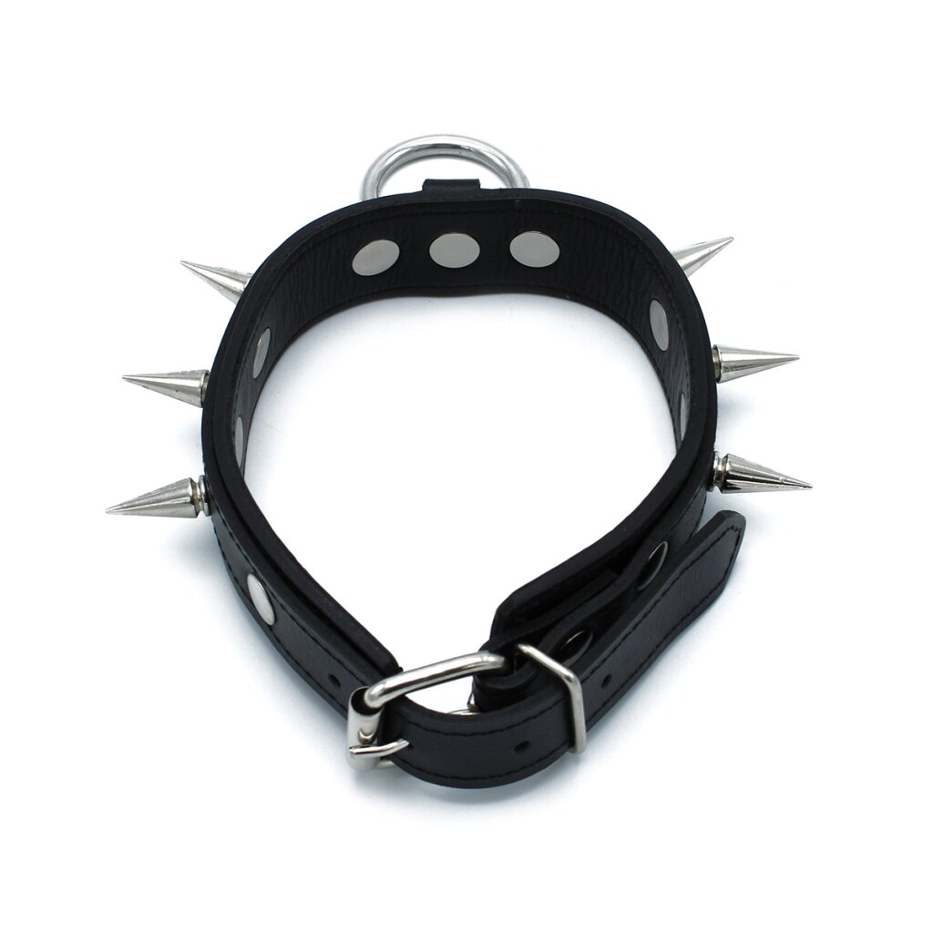 Das Black Leather Spiked Collar mit O-Ring vereint provokante Ästhetik mit funktionaler Vielseitigkeit. Gefertigt aus robustem schwarzem Leder, beeindruckt es mit gleichmäßig angeordneten Metallspikes, die dem Halsband eine markante, dominante Ausstrahlung verleihen.