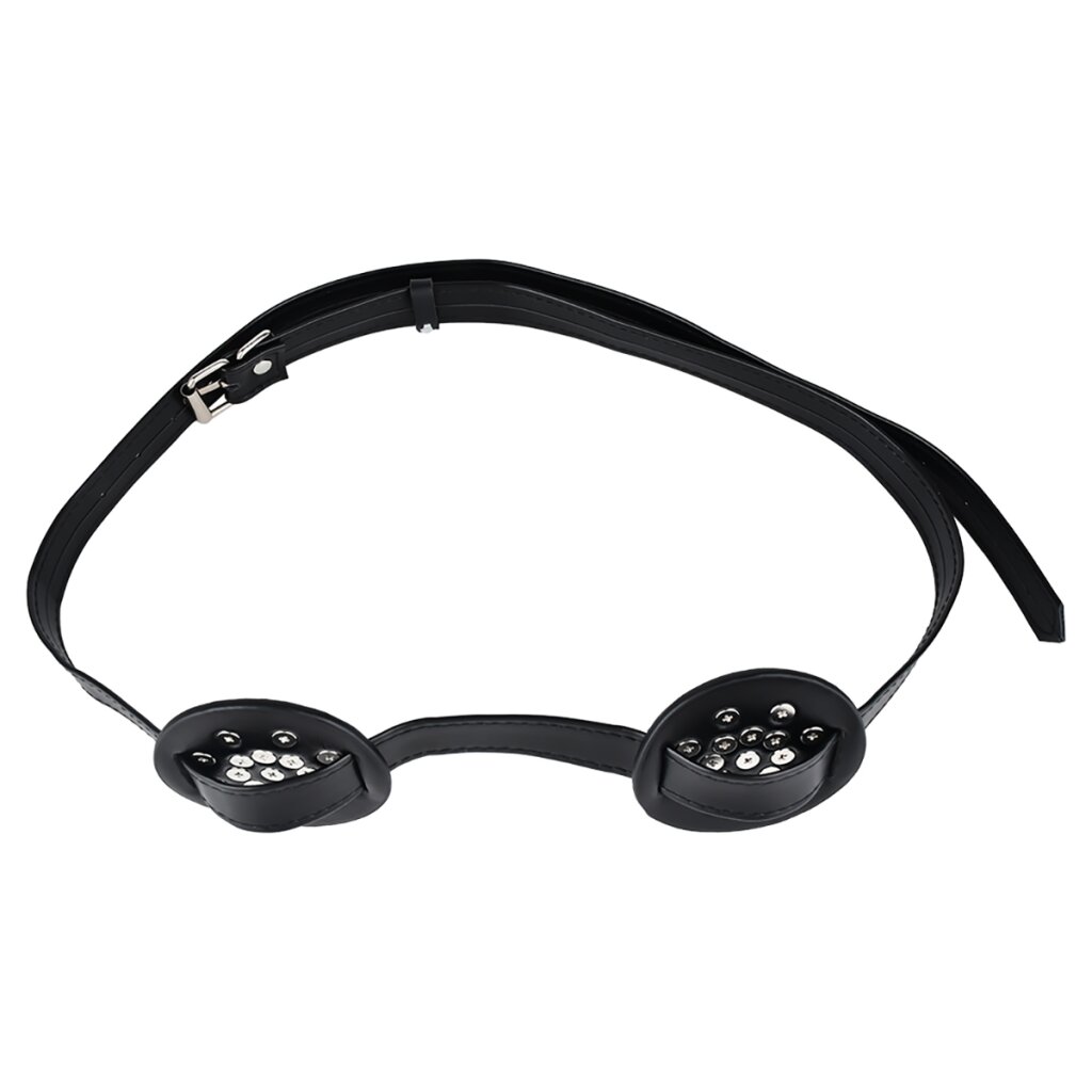 Gefertigt aus schwarzem PU-Leder und veredelt mit silberfarbenen Metallnieten, verfügt der Binder über zwei runde Brustplatten mit einem Durchmesser von 6,7 cm, verbunden durch einen glatten 2 cm breiten Mittelriemen. Im Inneren jeder Platte befinden sich geschlossene, spitze Dornen (0,8 cm hoch), die leicht auf die Haut drücken und dabei ein stimulierendes Kribbeln oder dekoratives Kink-Feeling erzeugen – ganz nach Lust und Intensität.