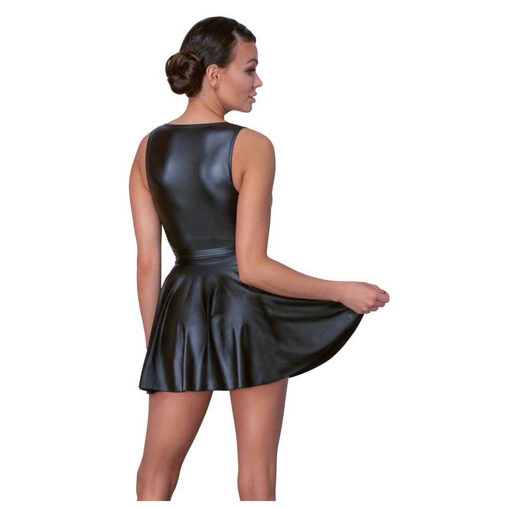 Oben eng geschnittenes, kurzes Kleid von Cottelli PARTY im schwarzen Mattlook mit ausgestelltem schwingendem Rock-Teil. Vorne extra tief in V-Form ausgeschnitten. In der Taille zwei mit Ringen verstellbarer Gürtel. Weich und hochelastisch für hohen Tragekomfort.