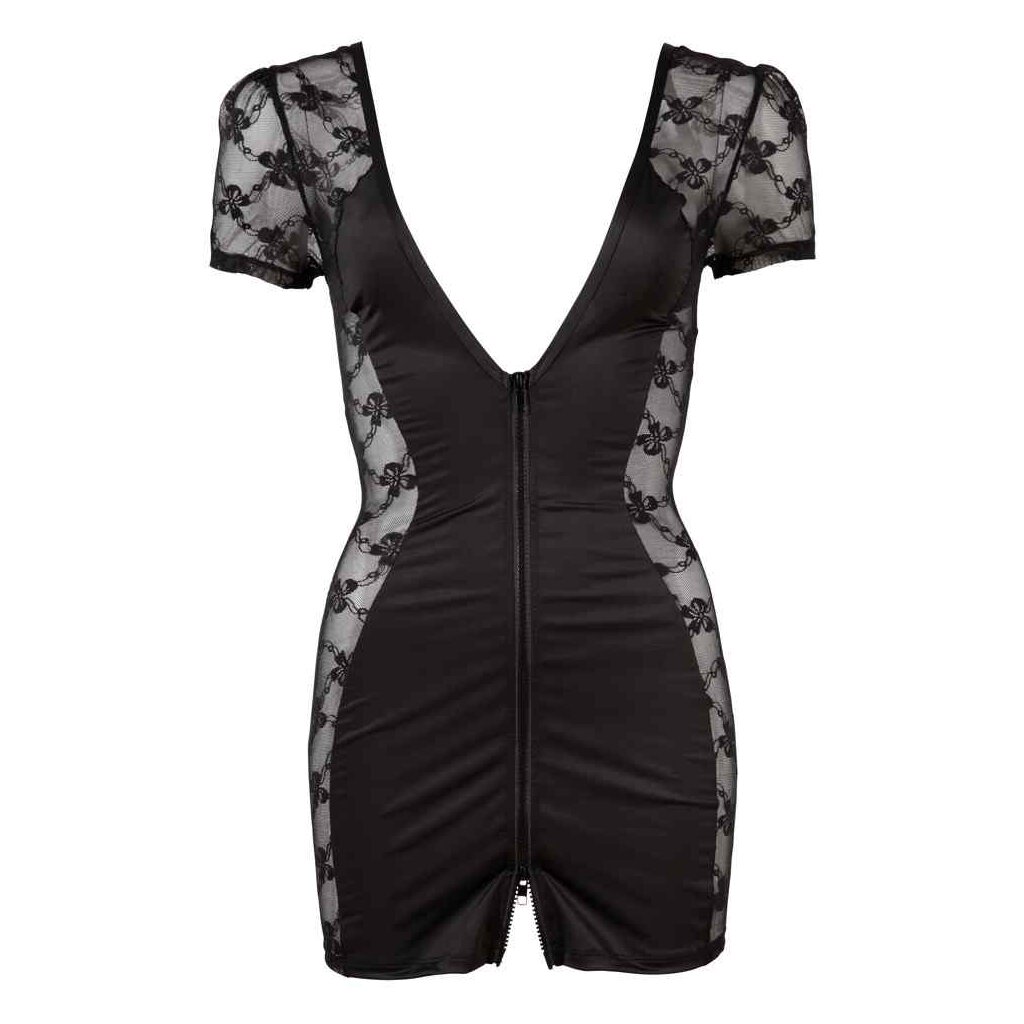 Transparent, tight-fitting dress with delicate lace at the sides. With short sleeves. Very low-cut at the front and the back. A 2-way zip at the front adds the perfect finishing touch to this sexy look.
