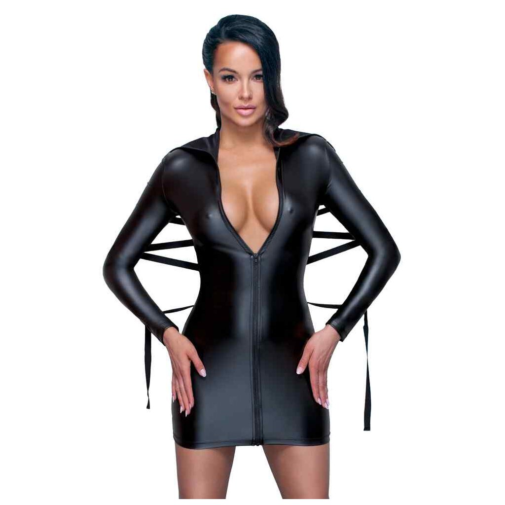 Elastic long-sleeved dress by Cottelli BONDAGE in a tight figure-hugging cut in black noble matt look. With extravagant high collar up to over the nose, where also the front zipper begins and runs through to the hem - the dress can thus be opened completely. The long arms are equipped with a reinforced striped trim, in which 5 bondage rings are incorporated in each case. With enclosed bondage tape, the arms can thus be fixed on the back.