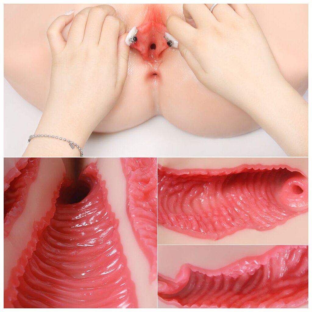Der Masturbator hat eine hautähnliche Struktur, realistische weiche Schamlippen, einen erregten G-Punkt und sogar einen A-Punkt und P-Punkt. Die Schäfte des Anus und der Vagina sind mit realistischen Rillen und Noppen bedeckt, die ein lebensechtes Gefühl vermitteln. Die Öffnung der Vagina misst 1 cm, was schmaler als eine echte Vagina ist, und passt sich perfekt der Größe Ihres Penis an.
