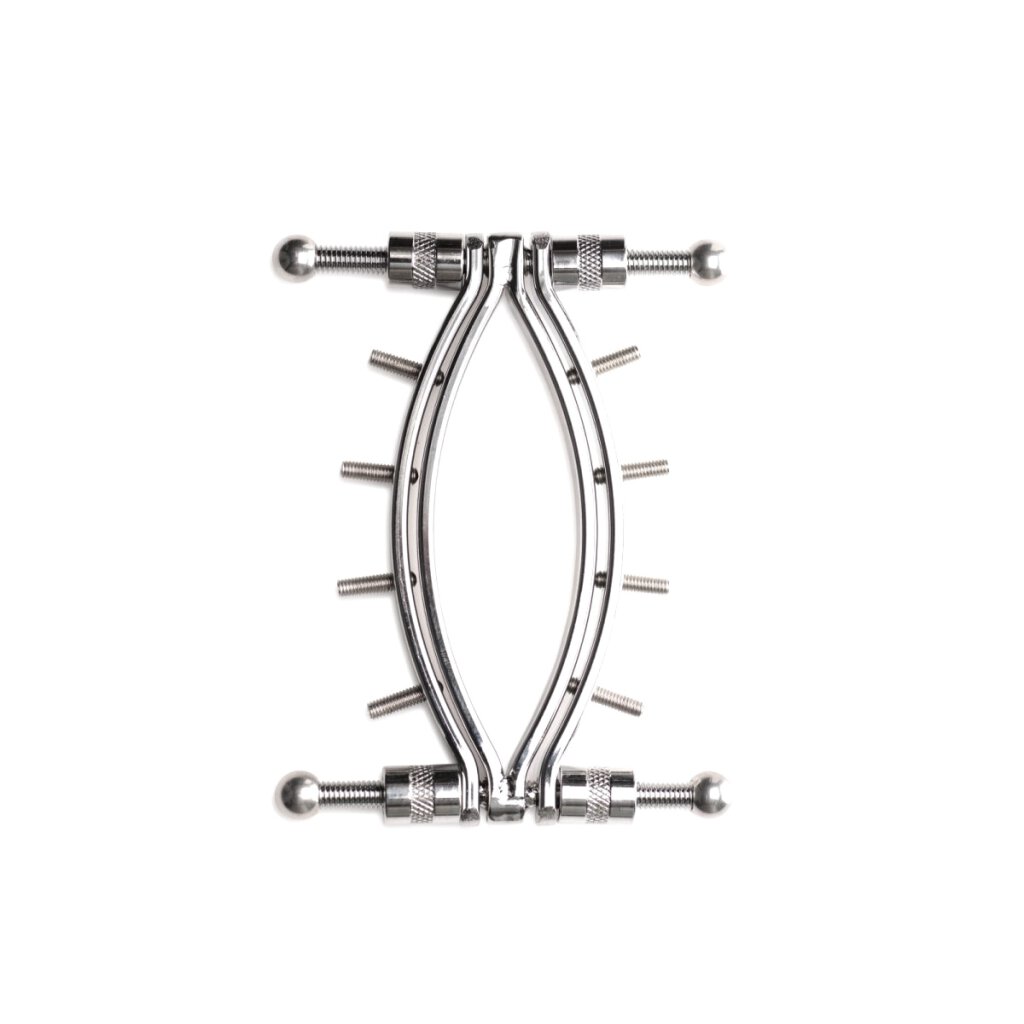 Spread her lips wide with this Spread 'Em Poker Labia Clamp! The clamps are made from durable, nickel-free, stainless steel. You can use any lubricant and clean them with boiling water and cleaning solutions between uses without damaging the device. There are two pressure screws at the top and bottom that you can turn to close the clamps against your labia and expose your vulva. Along each side of the clamps are rows of 4 squeeze screws - also known as pressure screws - that poke into the delicate tissue of the labia. The included Allen key can be used to adjust the clamp screws until they are in the right place. If the labia are already firmly clamped, the pressure screws exert so much pressure that any rotation can damage the tissue and nerves. So if you adjust the screws beforehand, the nerves stay healthy and your bottom can enjoy the full extent of sensation every time you play! Length of innermost hole: 95 mm / Diameter of innermost hole: 28 mm / Each side of the clamp opens to 15 mm in width / Materials: Stainless steel