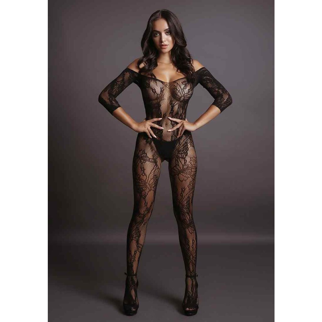Longsleeved bodystocking with lace pattern and open crotch. Can be worn on or off-shoulder. This bodystocking has some stretch and can be worn from size S to L.