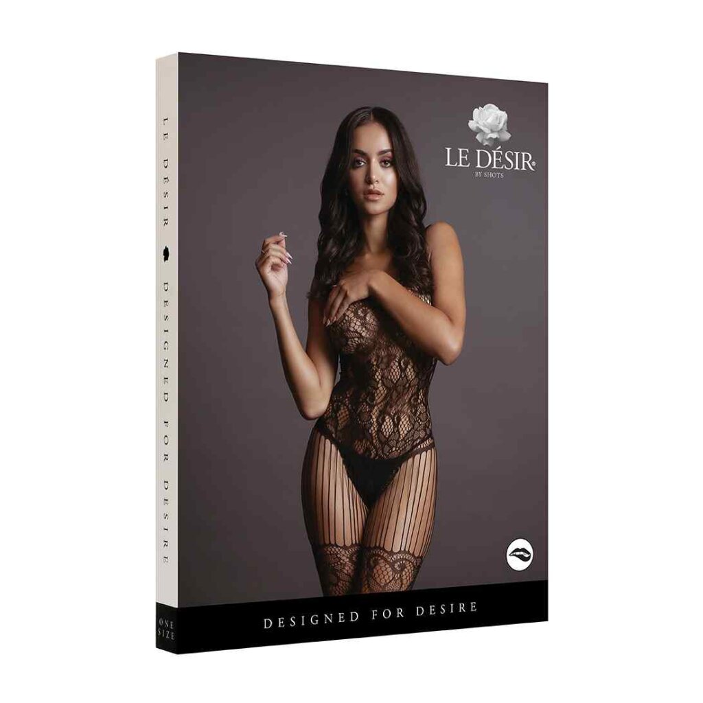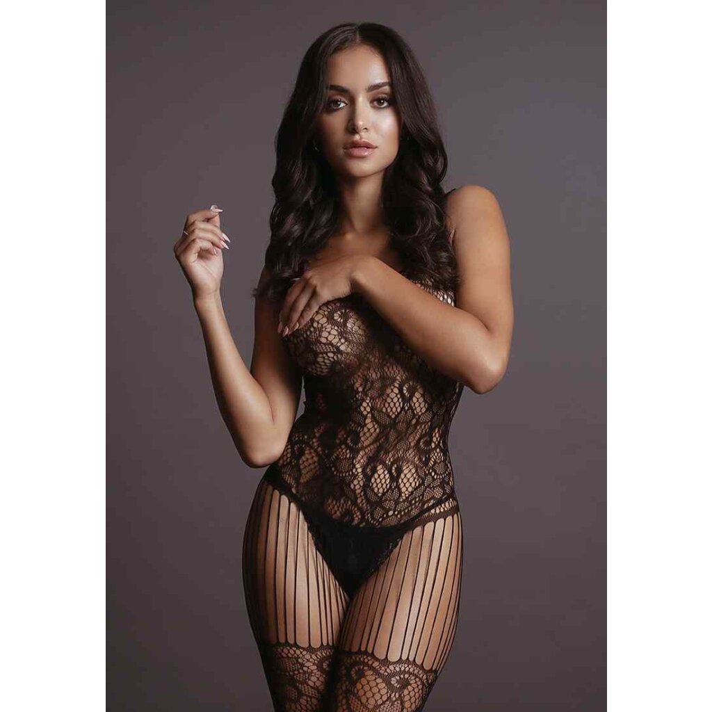 Bodystocking with lace-pattern and fishnet stockings with lace-pattern top. Stockings are attached with shredded straps. This bodystocking has a lot of stretch and can be worn from size S to XL.