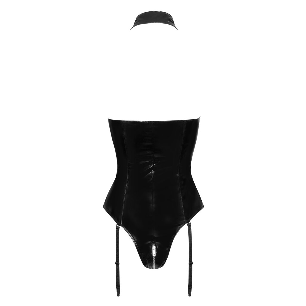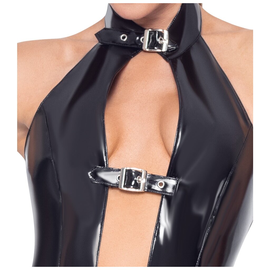 Aufreizender Body von Black Level ganz in schwarzem Lackglanz mit 4 verstellbaren und abnehmbaren Strapsen. Die offene Front wird mit 3 Schnallen und das Nackenband mit einer Schnalle geschlossen. Im Schritt mit 2-Wege-Reißverschluss zu öffnen.