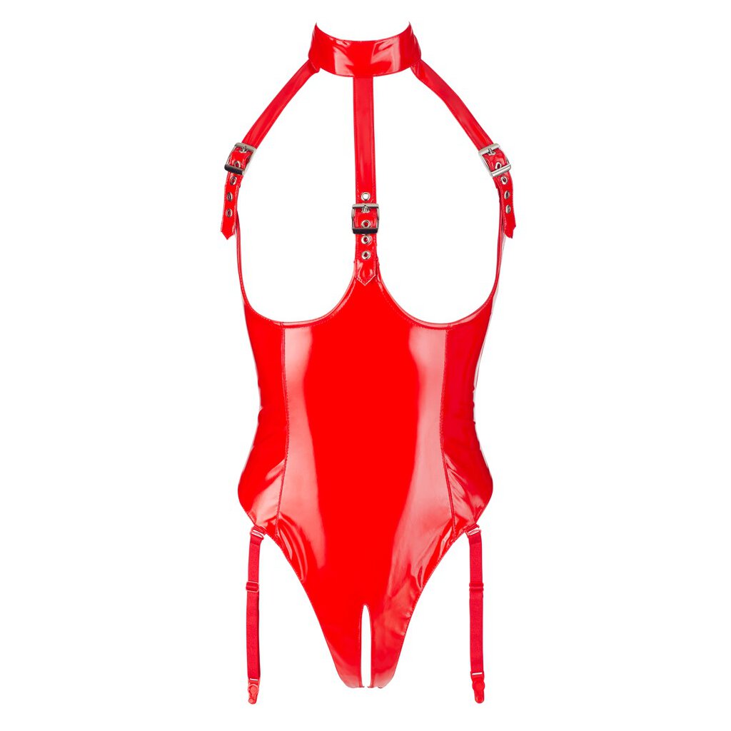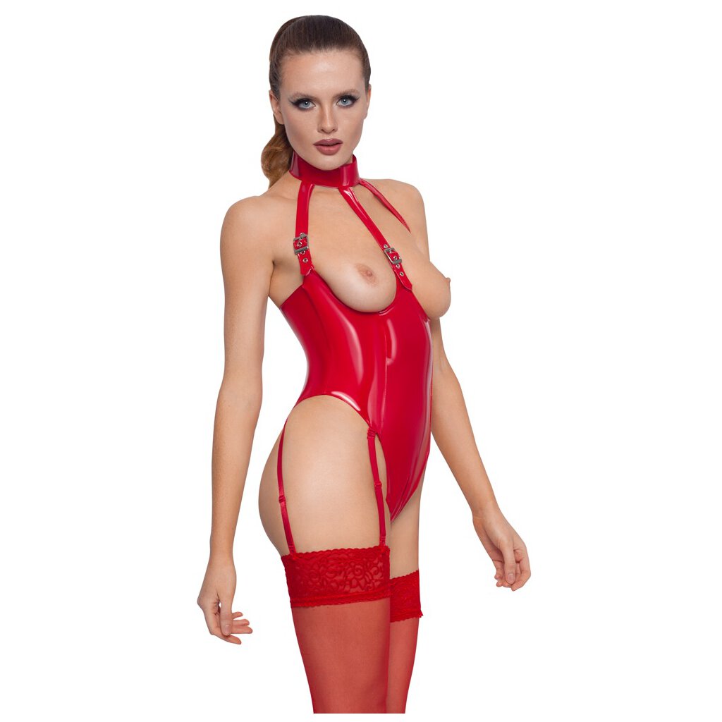 Busenfreier Body von Black Level komplett im feuerroten Lackglanz. Mit einladend offenem Schritt und verstell- sowie abnehmbaren Strumpfhaltern. Auf Bügel gearbeitet für optimalen busenfreien Sitz. 3 verstellbare Dekolleté-Riemen führen zum Halsband mit Druckknopfverschluss. Im Rücken mit praktischem Reißverschluss und Druckknopf.