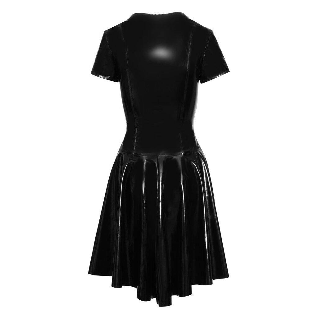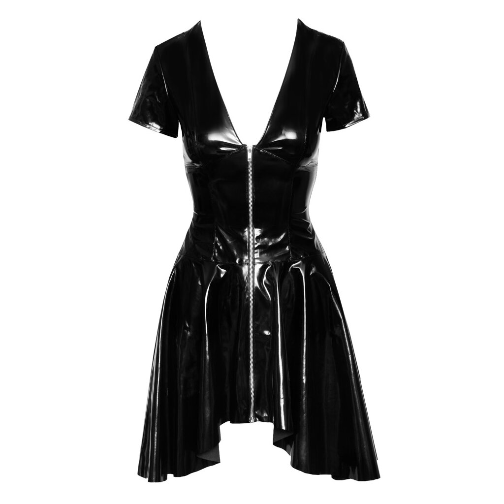 Halbarmkleid von Black Level komplett in schwarzem Lackglanz mit durchgehendem Metallreißverschluss vorne. In figurbetontem Schnitt mit extra tiefem V-Dekolleté. Der leicht ausgestellte, schwingende Rock ist vorne kürzer und hinten länger gearbeitet.