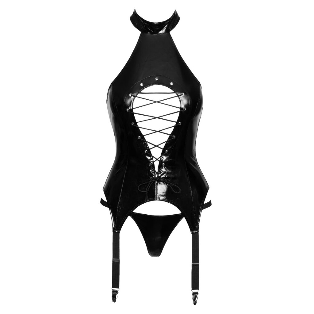 Ensemble de Black Level composé d'un porte-jarretelles et d'un string en verni noir brillant. Porte-jarretelles devant avec grande découpe sous un laçage variable. Dos nu - cou couché avec fermeture à pression. Fermeture éclair latérale pour un enfilage et un retrait faciles. Les 4 bretelles élastiques de la jarretelle sont réglables pour un ajustement optimal.