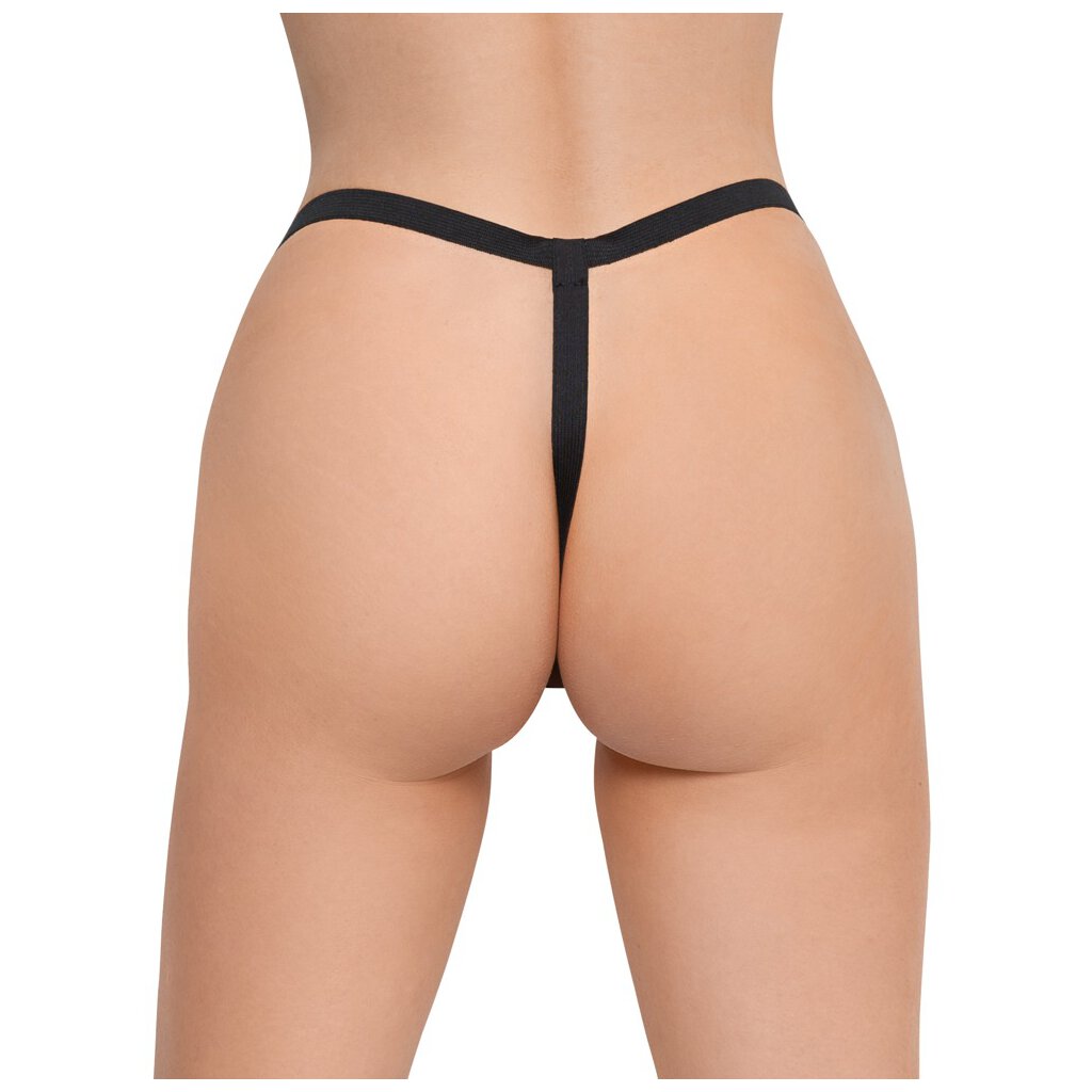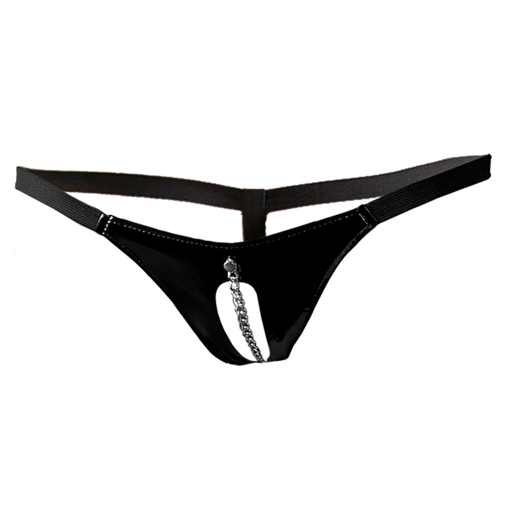 String von Black Level mit schwarzer glänzender, offener Lackfront, durch die ein Kettchen führt, das beim Tragen für aufregende Stimulationen sorgt. Seitlich und hinten mit Stretchbändern für die optimale Passform.
