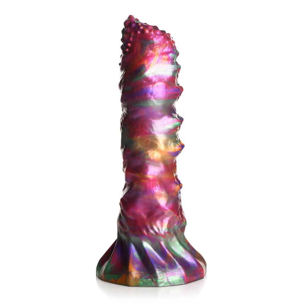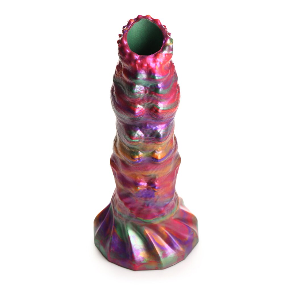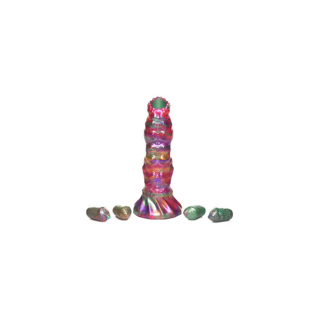It's time to get bred by alien visitors. This thick, textured shaft from Creature Cocks is one of the most colorful yet with a mix of rich, vibrant, iridescent colors with shades of pink, green, orange and purple. The shaft itself is large and thick with tiny bumps on the head, ribbed texture along the opposite side, and a mixture of textures along the rod down to the wide, suction cup base. It can be used hands-free with the assistance of the suction cup or combined with a compatible harness for penetrating strapon play or pegging! Insert any or all of the four larva eggs into the hollow sheath and then insert them into your hole, letting the ovipositor deposit those eggs to be birthed out of you later after you're full! Made out of flexible, super soft, premium silicone both the dildo and the eggs are phthalate-free, body-safe, and best used with water-based lubricants only. To clean after, use warm water and mild soap then spray with a toy cleaner before patting dry.