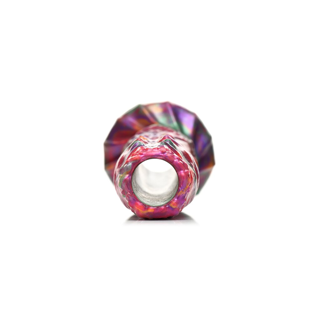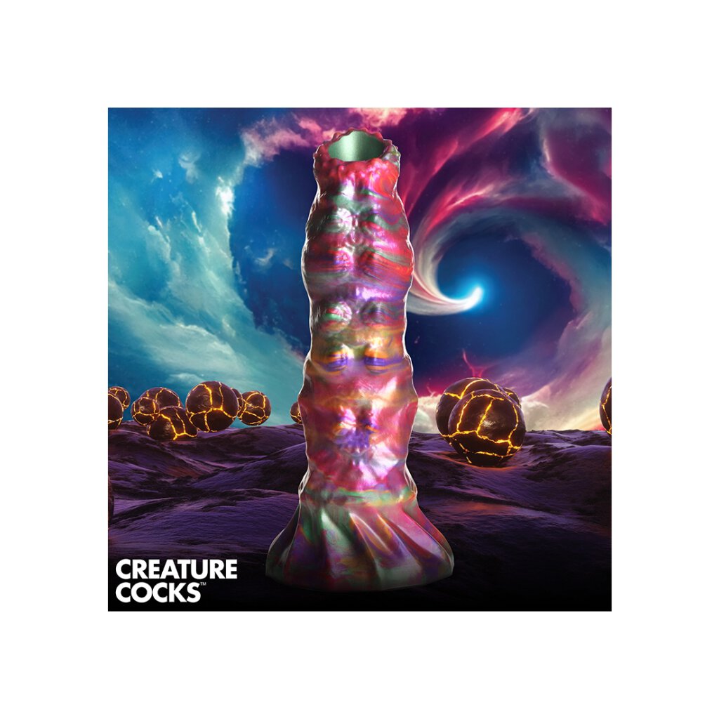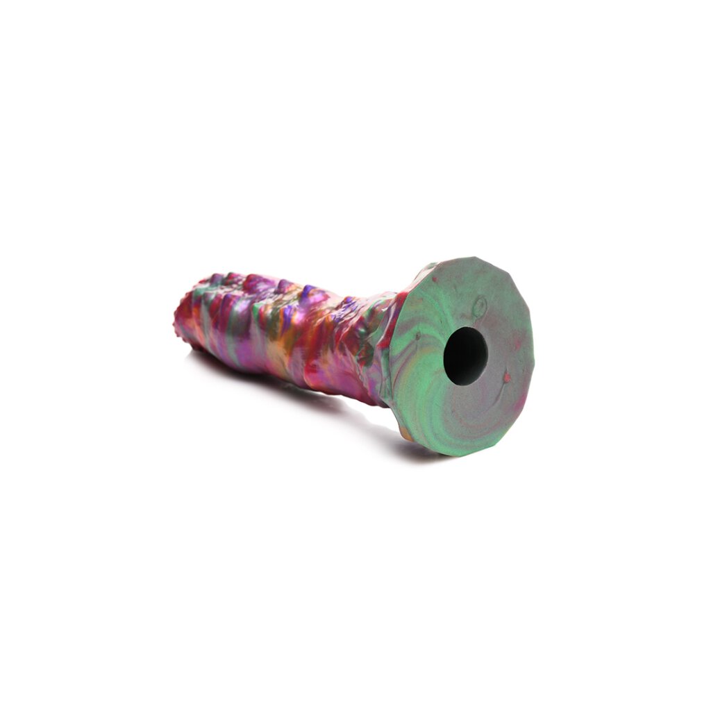 It's time to get bred by alien visitors. This thick, textured shaft from Creature Cocks is one of the most colorful yet with a mix of rich, vibrant, iridescent colors with shades of pink, green, orange and purple. The shaft itself is large and thick with tiny bumps on the head, ribbed texture along the opposite side, and a mixture of textures along the rod down to the wide, suction cup base. It can be used hands-free with the assistance of the suction cup or combined with a compatible harness for penetrating strapon play or pegging! Insert any or all of the four larva eggs into the hollow sheath and then insert them into your hole, letting the ovipositor deposit those eggs to be birthed out of you later after you're full! Made out of flexible, super soft, premium silicone both the dildo and the eggs are phthalate-free, body-safe, and best used with water-based lubricants only. To clean after, use warm water and mild soap then spray with a toy cleaner before patting dry.