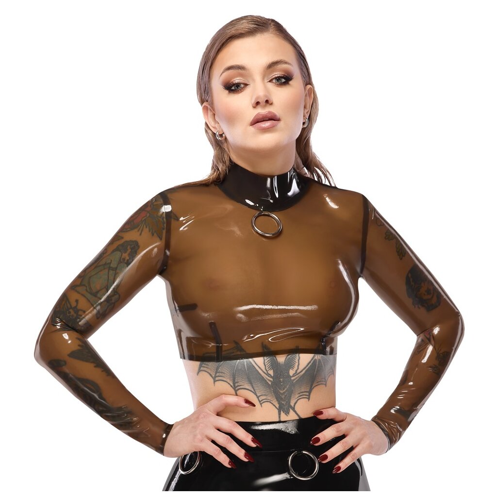 Bauchfreies Langarmshirt von LateX aus Naturlatex (geklebt) in rauchfarbener Transparenz. Mit einem großen dekorativen Metallring vorne unter dem stylischen Stehkragen. Mit durchgehendem Reißverschluss am Rücken für leichtes An- und Ausziehen.