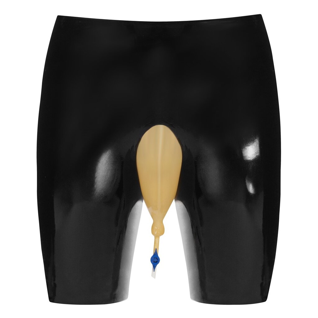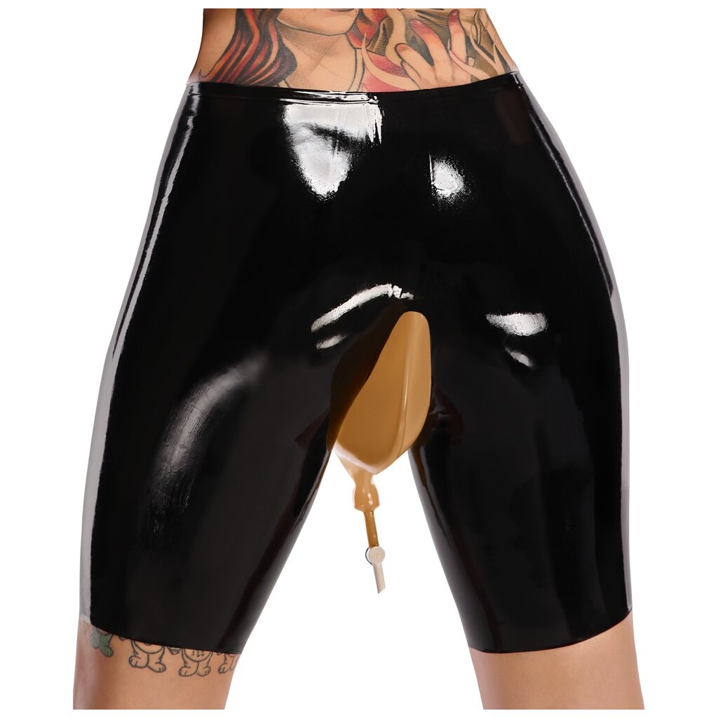 Schwarze Latex-Radlerhose von LateX mit transparentem Urinbeutel-Einsatz inklusive Ablasshahn.