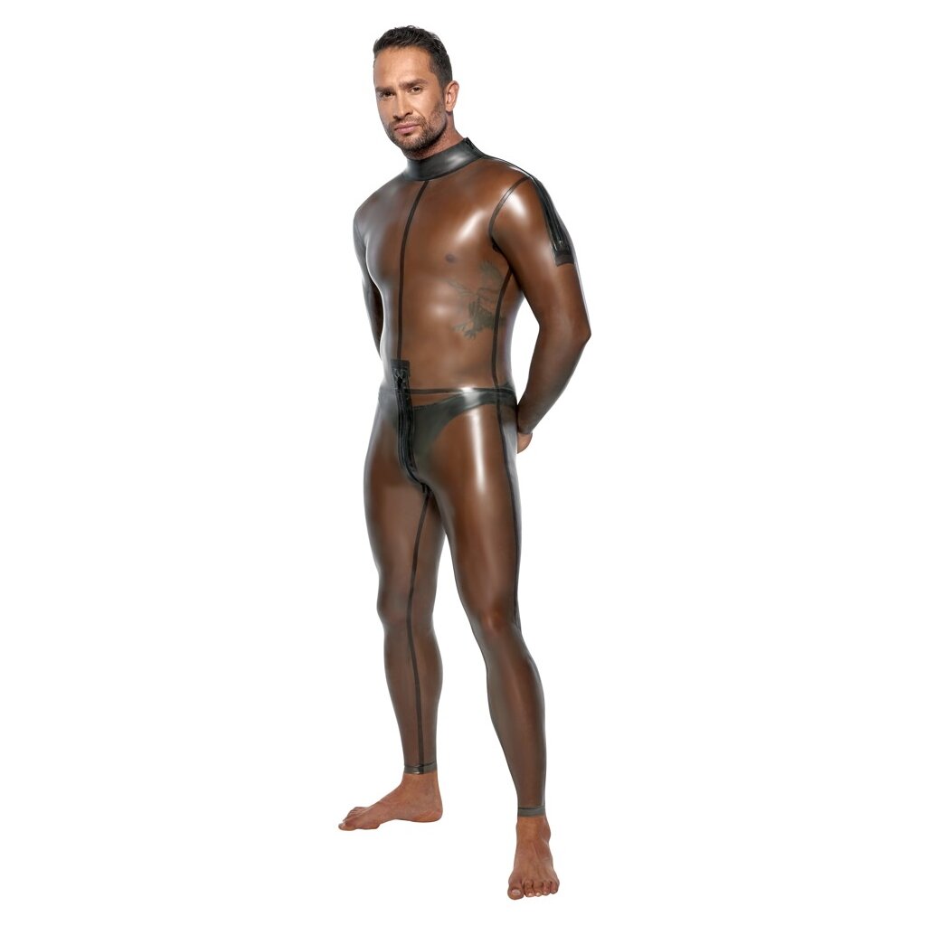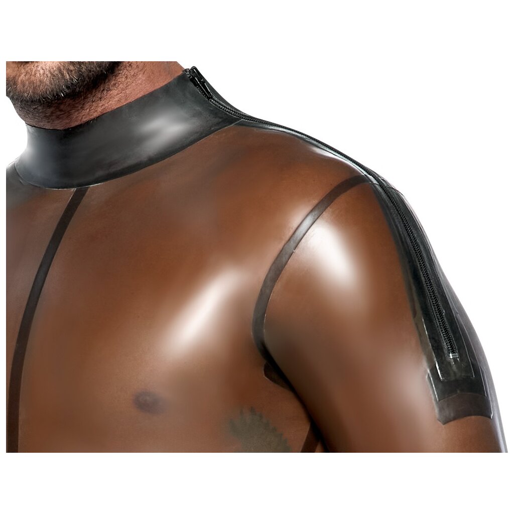 Combinaison à manches longues excitante entièrement réalisée en latex noir. Elle s'ajuste comme une seconde peau. Fermeture éclair sur chaque épaule jusqu'au col montant pour faciliter l'habillage et le déshabillage. La fermeture éclair pratique à l'entrejambe s'étend jusqu'aux fesses.