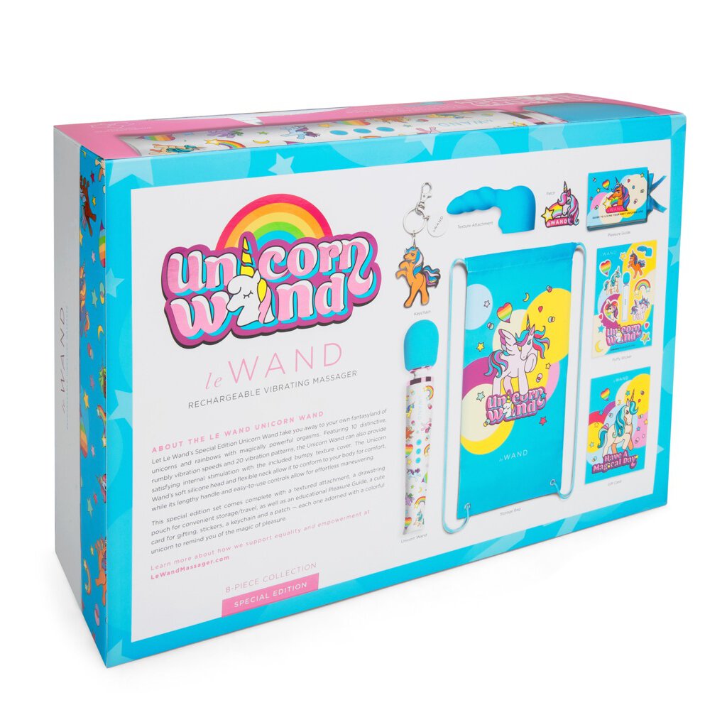 Rechargeable Unicorn Wand luxury massager from Le Wand in a rainbow-coloured design. Includes a unicorn dildo attachment and lots of other playful extras for imaginative massage fun with magical highlights! 20 vibration modes in 10 intensities quietly (max. 68 dB) provide plenty of variety. The 3-button control on the handle makes everything easy and convenient to control.