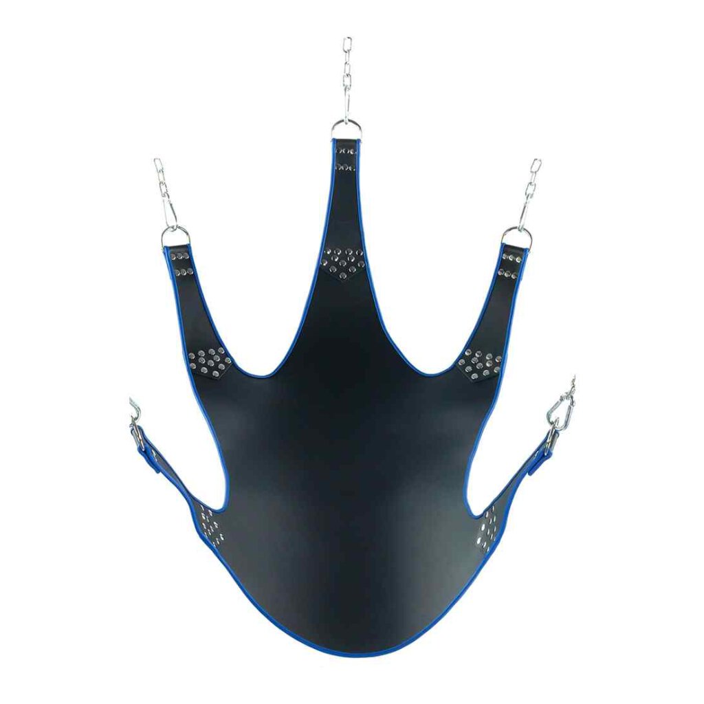 Der schwarze Schaukelzusatz wurde mit blauen Details und 5 Befestigungspunkten entworfen. Er ist 113 x 122 x 0,3 cm groß und wurde aus feinem und haltbarem Material aus echtem, pflanzlich gegerbtem Leder hergestellt.