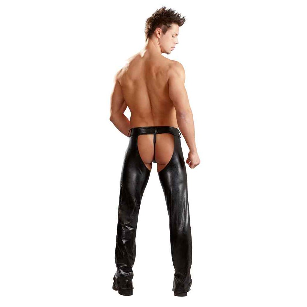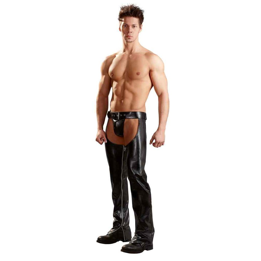 Duos puissant : chaps noir avec fermeture éclair à double sens sur l'intérieur des jambes et un string sexy assorti - tous deux en simili cuir élastique léger.
