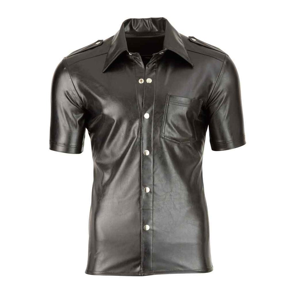 The press studs, epaulettes and chest pocket are the eye-catchers on this shirt. The shirt is made out of shiny black imitation leather. It is slightly fitted at the waist and emphasises muscles. Can also be worn with jeans! 98% polyester, 2% spandex with a polyurethane coating.