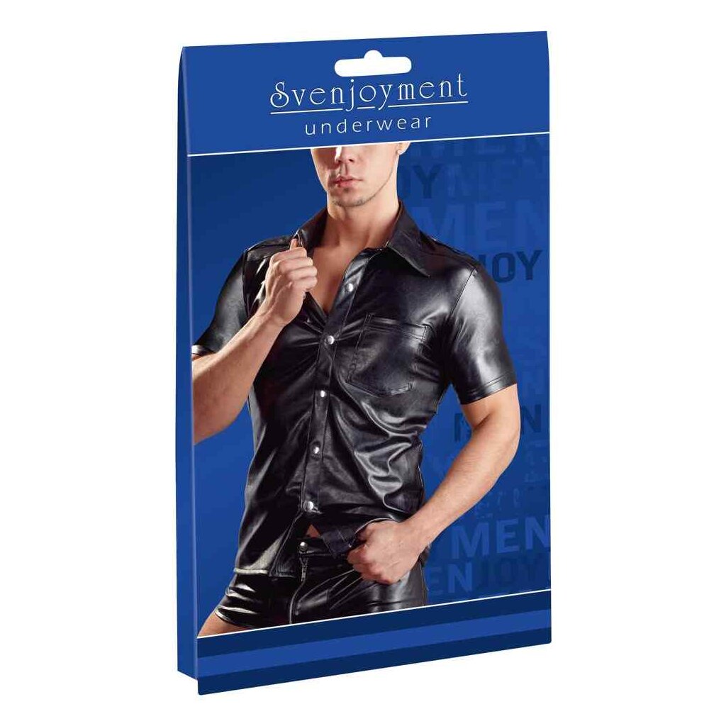 The press studs, epaulettes and chest pocket are the eye-catchers on this shirt. The shirt is made out of shiny black imitation leather. It is slightly fitted at the waist and emphasises muscles. Can also be worn with jeans! 98% polyester, 2% spandex with a polyurethane coating.