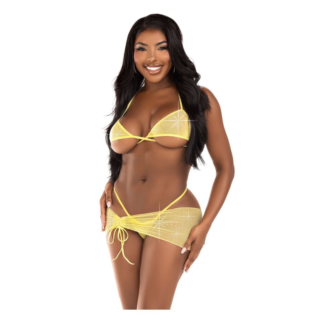 Préparez-vous à rehausser votre charme avec l'irrésistible ensemble de lingerie trois pièces de Leg Avenues. Cet ensemble de lingerie transparente ultra-flirty comprend un soutien-gorge enveloppant en maille avec strass, une culotte string et un cache-cœur avec un nœud à volants. Que vous cherchiez à vous faire plaisir en vacances ou à séduire dans la chambre à coucher, cet ensemble de lingerie pour femmes est prêt pour vous. Conçu pour hypnotiser les cœurs et accélérer le pouls.